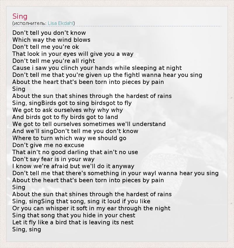Don't tell you don't know Which way the wind blows Don't tell me you're ok That look in your eyes will give you a way Don't tell me you're all right Cause i saw you clinch your hands while sleeping at night Don't tell me that you're given up the fightI wanna hear you sing About the heart that's been torn into pieces by pain Sing About the sun that shines through the hardest of rains Sing, singBirds got to sing birdsgot to fly We got to ask ourselves why why why And birds got to fly birds got to land We got to tell ourselves sometimes we'll understand And we'll singDon't tell me you don't know Where to turn which way we should go Don't give me no excuse That ain't no good darling that ain't no use Don't say fear is in your way I know we're afraid but we'll do it anyway Don't tell me that there's something in your wayI wanna hear you sing About the heart that's been torn into pieces by pain Sing About the sun that shines through the hardest of rains Sing, singSing that song, sing it loud if you like Or you can whisper it soft in my ear through the night Sing that song that you hide in your chest Let it fly like a bird that is leaving its nest Sing, sing