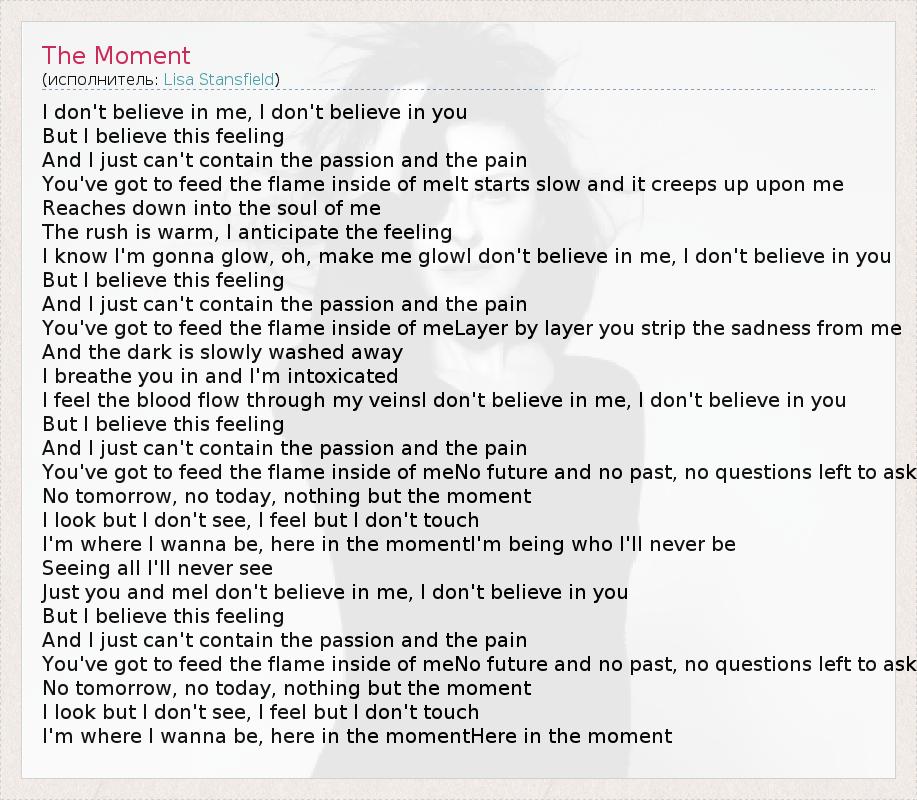 I'm where l wanna be, here in the momentI'm being who I'll never be