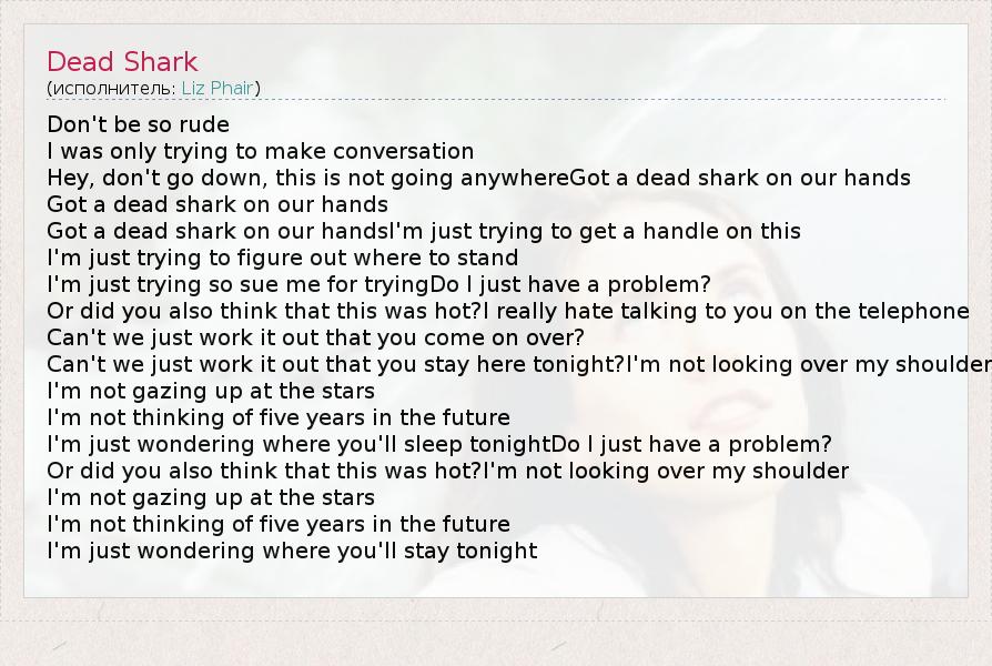 Don't be so rude I was only trying to make conversation Hey, don't go down, this is not going anywhereGot a dead shark on our hands Got a dead shark on our hands Got a dead shark on our handsI'm just trying to get a handle on this I'm just trying to figure out where to stand I'm just trying so sue me for tryingDo I just have a problem? Or did you also think that this was hot?I really hate talking to you on the telephone Can't we just work it out that you come on over? Can't we just work it out that you stay here tonight?I'm not looking over my shoulder I'm not gazing up at the stars I'm not thinking of five years in the future I'm just wondering where you'll sleep tonightDo I just have a problem? Or did you also think that this was hot?I'm not looking over my shoulder I'm not gazing up at the stars I'm not thinking of five years in the future I'm just wondering where you'll stay tonight