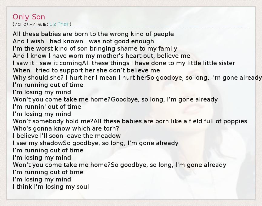 Won't you come take me home?Goodbye, so long, I'm gone already