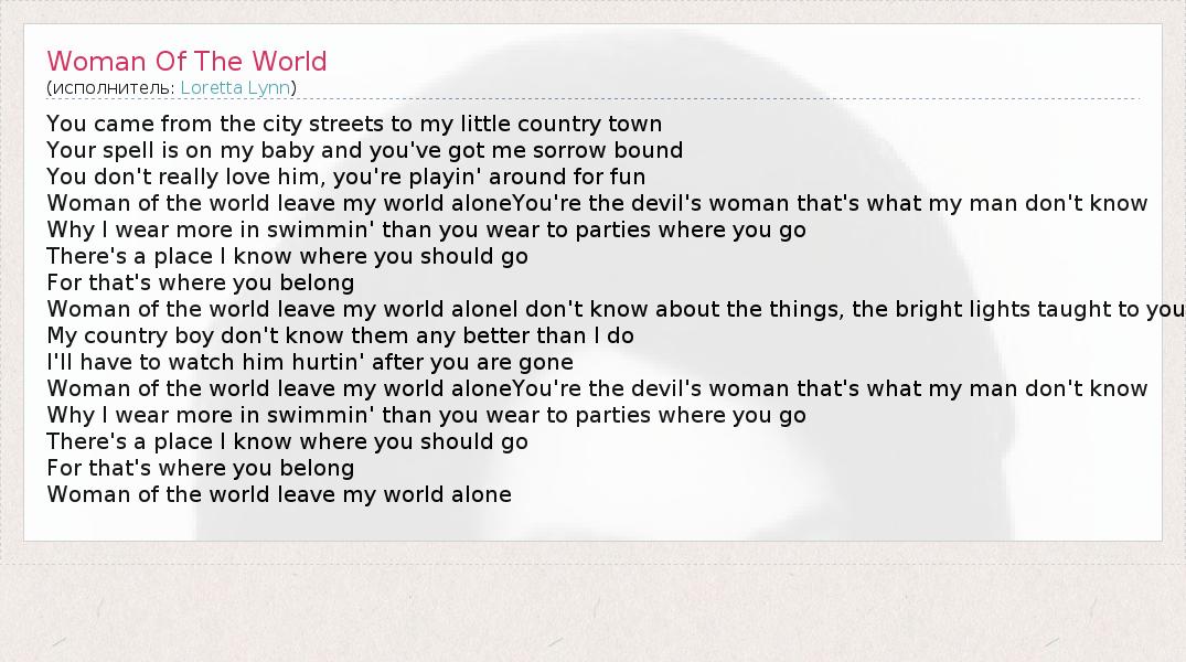 А как ты думаешь, о чем песня "Woman Of The World" ?