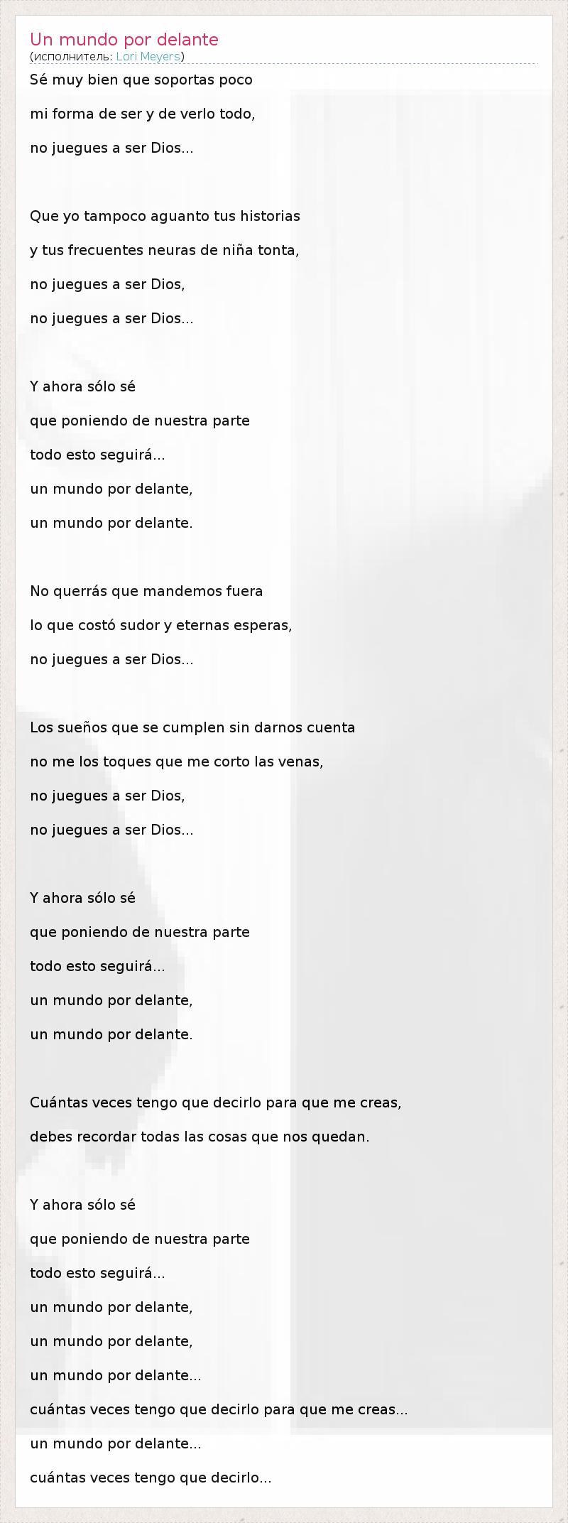 Sé muy bien que soportas poco mi forma de ser y de verlo todo, no juegues a ser Dios... Que yo tampoco aguanto tus historias y tus frecuentes neuras de niña tonta, no juegues a ser Dios, no juegues a ser Dios... Y ahora sólo sé que poniendo de nuestra parte todo esto seguirá... un mundo por delante, un mundo por delante. No querrás que mandemos fuera lo que costó sudor y eternas esperas, no juegues a ser Dios... Los sueños que se cumplen sin darnos cuenta no me los toques que me corto las venas, no juegues a ser Dios, no juegues a ser Dios... Y ahora sólo sé que poniendo de nuestra parte todo esto seguirá... un mundo por delante, un mundo por delante. Cuántas veces tengo que decirlo para que me creas, debes recordar todas las cosas que nos quedan. Y ahora sólo sé que poniendo de nuestra parte todo esto seguirá... un mundo por delante, un mundo por delante, un mundo por delante... cuántas veces tengo que decirlo para que me creas... un mundo por delante... cuántas veces tengo que decirlo...