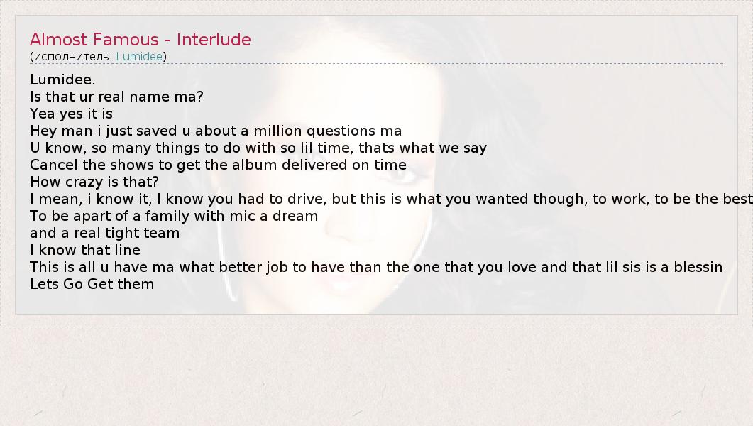 А как ты думаешь, о чем песня "Almost Famous - Interlude" ?