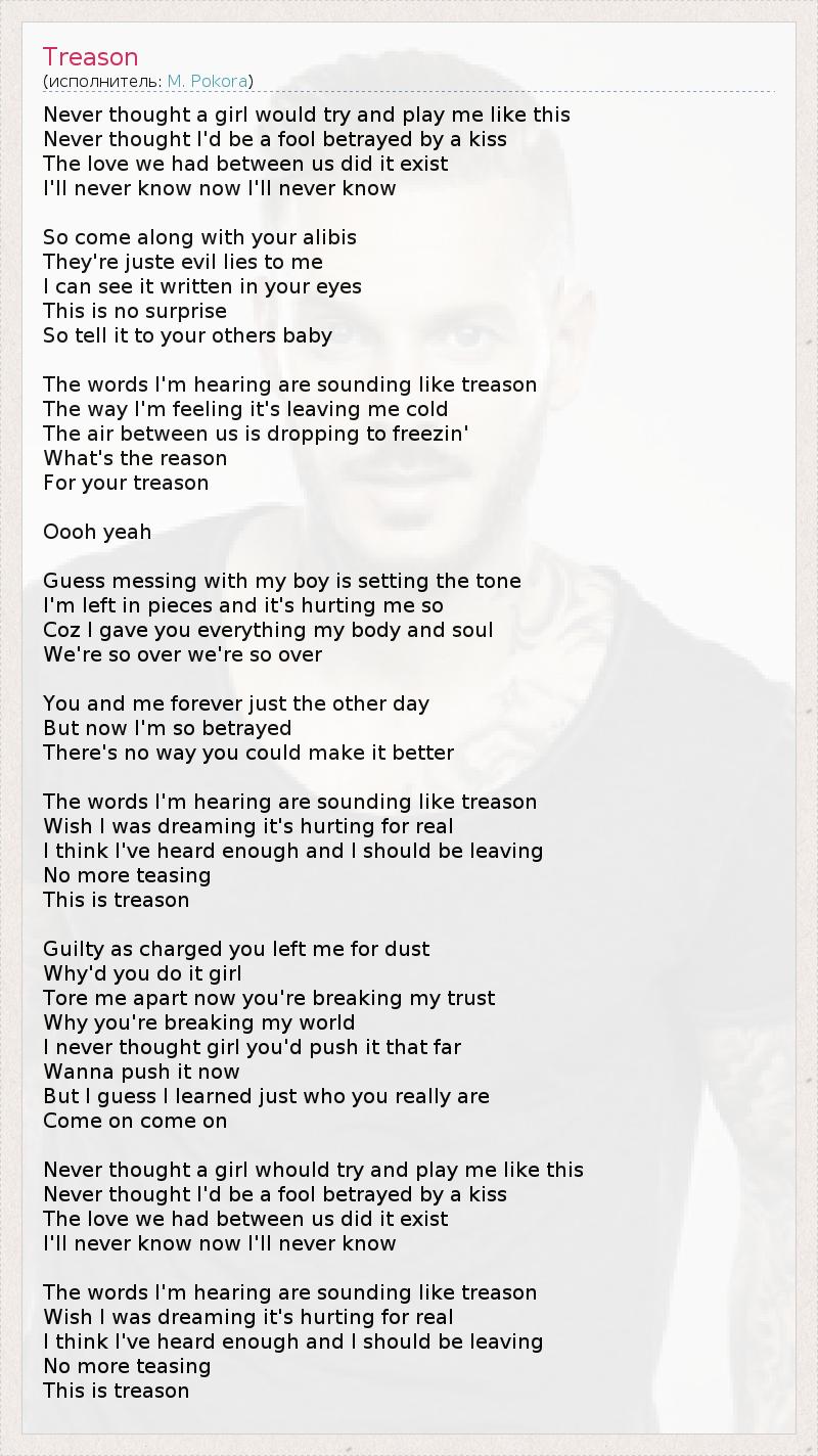 Never thought a girl would try and play me like this Never thought I'd be a fool betrayed by a kiss The love we had between us did it exist I'll never know now I'll never know So come along with your alibis They're juste evil lies to me I can see it written in your eyes This is no surprise So tell it to your others baby The words I'm hearing are sounding like treason The way I'm feeling it's leaving me cold The air between us is dropping to freezin' What's the reason For your treason Oooh yeah Guess messing with my boy is setting the tone I'm left in pieces and it's hurting me so Coz I gave you everything my body and soul We're so over we're so over You and me forever just the other day But now I'm so betrayed There's no way you could make it better The words I'm hearing are sounding like treason Wish I was dreaming it's hurting for real I think I've heard enough and I should be leaving No more teasing This is treason Guilty as charged you left me for dust Why'd you do it girl Tore me apart now you're breaking my trust Why you're breaking my world I never thought girl you'd push it that far Wanna push it now But I guess I learned just who you really are Come on come on Never thought a girl whould try and play me like this Never thought I'd be a fool betrayed by a kiss The love we had between us did it exist I'll never know now I'll never know The words I'm hearing are sounding like treason Wish I was dreaming it's hurting for real I think I've heard enough and I should be leaving No more teasing This is treason