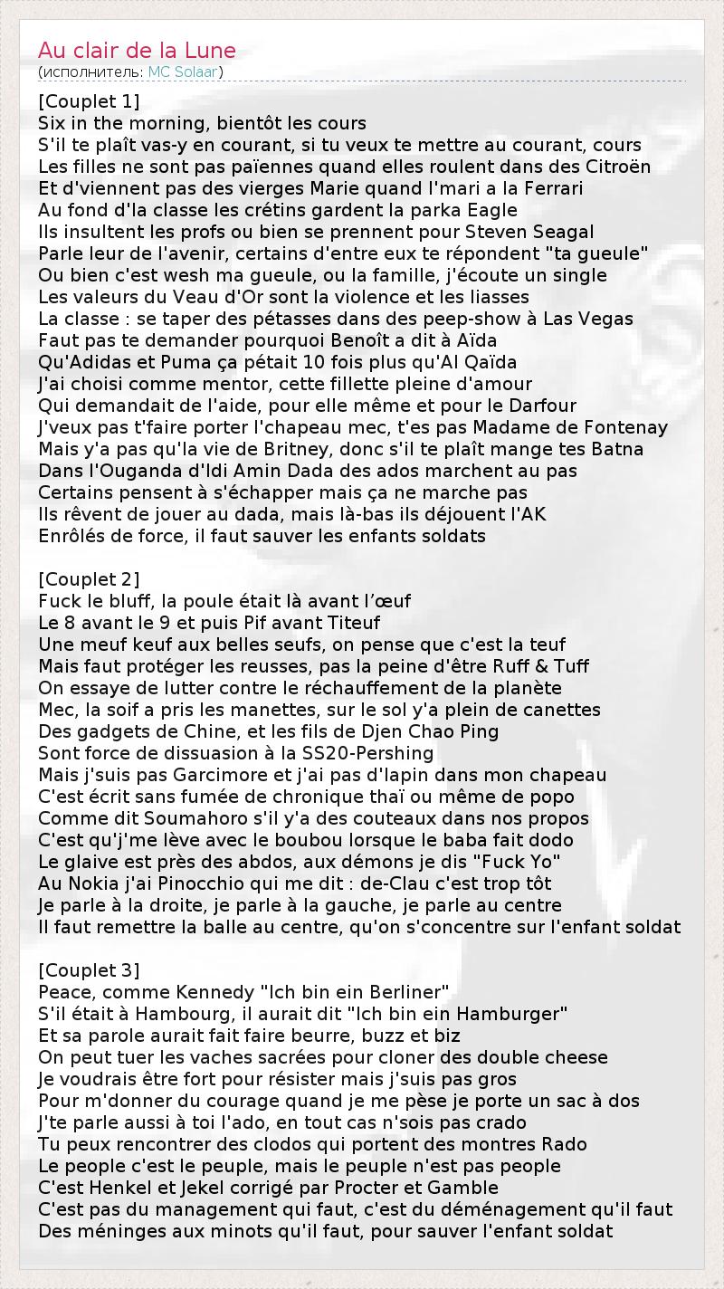 [Couplet 1] Six in the morning, bientôt les cours S'il te plaît vas-y en courant, si tu veux te mettre au courant, cours Les filles ne sont pas païennes quand elles roulent dans des Citroën Et d'viennent pas des vierges Marie quand l'mari a la Ferrari Au fond d'la classe les crétins gardent la parka Eagle Ils insultent les profs ou bien se prennent pour Steven Seagal Parle leur de l'avenir, certains d'entre eux te répondent "ta gueule" Ou bien c'est wesh ma gueule, ou la famille, j'écoute un single Les valeurs du Veau d'Or sont la violence et les liasses La classe : se taper des pétasses dans des peep-show à Las Vegas Faut pas te demander pourquoi Benoît a dit à Aïda Qu'Adidas et Puma ça pétait 10 fois plus qu'Al Qaïda J'ai choisi comme mentor, cette fillette pleine d'amour Qui demandait de l'aide, pour elle même et pour le Darfour J'veux pas t'faire porter l'chapeau mec, t'es pas Madame de Fontenay Mais y'a pas qu'la vie de Britney, donc s'il te plaît mange tes Batna Dans l'Ouganda d'Idi Amin Dada des ados marchent au pas Certains pensent à s'échapper mais ça ne marche pas Ils rêvent de jouer au dada, mais là-bas ils déjouent l'AK Enrôlés de force, il faut sauver les enfants soldats [Couplet 2] Fuck le bluff, la poule était là avant l’œuf Le 8 avant le 9 et puis Pif avant Titeuf Une meuf keuf aux belles seufs, on pense que c'est la teuf Mais faut protéger les reusses, pas la peine d'être Ruff & Tuff On essaye de lutter contre le réchauffement de la planète Mec, la soif a pris les manettes, sur le sol y'a plein de canettes Des gadgets de Chine, et les fils de Djen Chao Ping Sont force de dissuasion à la SS20-Pershing Mais j'suis pas Garcimore et j'ai pas d'lapin dans mon chapeau C'est écrit sans fumée de chronique thaï ou même de popo Comme dit Soumahoro s'il y'a des couteaux dans nos propos C'est qu'j'me lève avec le boubou lorsque le baba fait dodo Le glaive est près des abdos, aux démons je dis "Fuck Yo" Au Nokia j'ai Pinocchio qui me dit : de-Clau c'est trop tôt Je parle à la droite, je parle à la gauche, je parle au centre Il faut remettre la balle au centre, qu'on s'concentre sur l'enfant soldat [Couplet 3] Peace, comme Kennedy "Ich bin ein Berliner" S'il était à Hambourg, il aurait dit "Ich bin ein Hamburger" Et sa parole aurait fait faire beurre, buzz et biz On peut tuer les vaches sacrées pour cloner des double cheese Je voudrais être fort pour résister mais j'suis pas gros Pour m'donner du courage quand je me pèse je porte un sac à dos J'te parle aussi à toi l'ado, en tout cas n'sois pas crado Tu peux rencontrer des clodos qui portent des montres Rado Le people c'est le peuple, mais le peuple n'est pas people C'est Henkel et Jekel corrigé par Procter et Gamble C'est pas du management qui faut, c'est du déménagement qu'il faut Des méninges aux minots qu'il faut, pour sauver l'enfant soldat