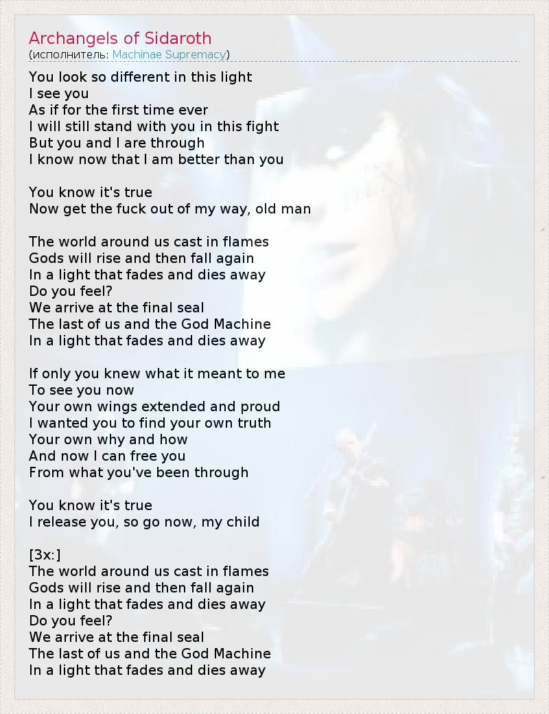 В этом свете ты выглядишь совсем иначе. Я вижу тебя Как будто в первый раз. В этой битве я буду сражаться на твоей стороне, Но дальше нам не по пути. Теперь я знаю, что я лучше тебя. И ты знаешь, что это так. А теперь убирайся с моей дороги, старик! Мир вокруг нас охвачен пламенем. Боги восстанут и падут В меркнущем, умирающем свете. Чувствуешь? Скоро будет сломана последняя печать. Последний из нас против Бога-Машины В меркнущем, умирающем свете. Если бы ты только знал, что значило для меня Увидеть тебя сейчас. Ты полон сил и достоинства. Я хотел, чтобы ты нашел свою собственную истину, Понял, почему и как ты живешь. Сейчас я могу освободить тебя От того, что тебе пришлось пережить. Ты знаешь, что это правда. Я освобождаю тебя. Ты свободен, дитя мое! [3x:] Мир вокруг нас охвачен пламенем. Боги восстанут и падут В меркнущем, умирающем свете. Чувствуешь? Скоро будет сломана последняя печать. Последний из нас против Бога-Машины В меркнущем, умирающем свете. * Десятая песня альбома Phantom Shadow. Тексты песен этого альбома лучше читать в том порядке, в котором они идут на диске.