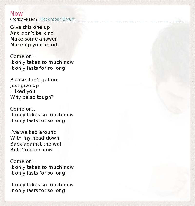Give this one up And don’t be kind Make some answer Make up your mind Come on… It only takes so much now It only lasts for so long Please don’t get out Just give up I liked you Why be so tough? Come on… It only takes so much now It only lasts for so long I’ve walked around With my head down Back against the wall But i’m back now Come on… It only takes so much now It only lasts for so long It only takes so much now It only lasts for so long