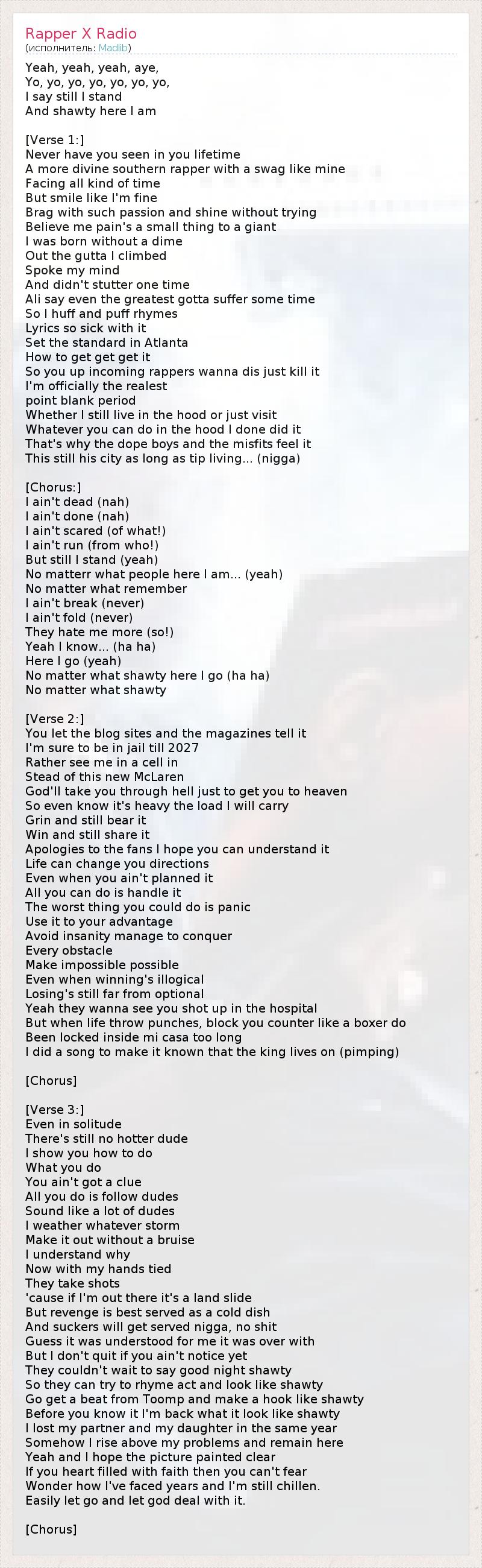Да, да, да, эй, йо, йо... Говорю - я всё ещё здесь, И детка, вот он я... [Куплет 1:] Вы в жизни никогда не видели Рэпера с юга божественнее меня и с таким же стилем. Много чего повидал, Но всегда улыбаюсь так, будто всё в порядке. Показываю свои навыки с такой страстью и сияю без напряга. Поверь мне, боль - это мелочь для гиганта, Я был рождён без копейки, Выкарабкался из трущоб. Направлял свой разум И не заикался ни разу. Али 1 сказал, что даже величайшие должны страдать. Так что, разгорячившись, я выдаю рифмы, И лирика от этого лишь отпаднее. Установил в Атланте стандарт того, Как достигать цели. Так что, восходящие рэперы, хотите этого - просто доведите дело до конца. Я официально наиреальнейший чел - Король юга в этой эпохе 2! Пусть я всё еще живу в гетто или только навещаю его, Чем бы ты ни занимался в гетто, я это уже делал! Вот почему барыги и всякие неудачники понимают: Это всё еще мой город, до тех пор, пока Tip 3 жив! [Припев:] Я не мёртв (неа)! Я не выдохся (неа)! Я не испуган (чего)! Я не убежал (от кого)! Я все ещё здесь стою (да)! Несмотря ни на что, люди, вот он я... (да)! Несмотря ни на что, запомните! Я не сломлюсь (никогда)! Я не согнусь (никогда)! Они ненавидят меня сильнее (так что)! Да, я знаю (ха ха)! Вот и я (да)! Несмотря ни на что, детка, вот он я (ха ха)! Несмотря ни на что! [Куплет 2:] Вы веришь сплетням из блогов и журналов, Будто я точно пробуду в тюрьме до 2027 года 4. Ты лучше увидишь меня за решеткой, Чем за рулём нового McLaren 5. Господь пронесёт тебя через ад, просто чтобы открыть тебе путь в рай. Так что я знаю, мне придётся нести тяжёлое бремя, Изображать улыбки и терпеть, Одерживать победы и делиться ими. Извинения моим поклонникам - надеюсь, вы поймёте, Что жизнь может поменять ваши ориентиры, Даже если вы этого не планировали. Всё, что остаётся делать – пытаться справиться с этим, Худшее, что вы можете сделать - это начать паниковать. Используйте ситуацию в своих интересах, Избегайте безумия, сумейте обойти Все препятствия! Сделайте невозможное возможным, Даже когда победа нелогична, Поражение ещё отсутствует даже как возможность. Да, они хотят видеть тебя раненым в госпитале, Но когда жизнь наносит удары, блокируй удар, как боксёр. Слишком долго я был заперт внутри своего дома 6, Я написал песню, чтобы объявить во всеуслышание - король жив 7 (и промышляет!) [Припев] [Куплет 3:] Даже если я одинок, Нет рэпера круче. Я покажу вам, как это делается - То, чем вы занимаетесь. Вы не имеете понятия о том, Что только и делаете, что повторяете, Кажется, многие из вас. Я выдержу любую бурю, Выйду из неё без особых ран. И понимаю почему. Теперь, когда у меня связаны руки, Они делают выпады в мою сторону, Ведь если бы я не был скован, то на них обрушился бы оползень. Но месть лучше всего подавать холодной, И сосунки будут уделаны, без базара! Думаю, тут всё ясно, тогда я не мог враждовать, Но я не закончу карьеру, если вы ещё не заметили! А им не терпится дождаться моего ухода, Чтобы попытаться рифмовать, как я, и перенять мой стиль, Использовать бит от Тумпа 9 и написать припев, как у меня. Не успеешь сказать "А", я вернусь, и на что это похоже 8? Я потерял лучшего друга и свою дочь в один и тот же год 10. Так или иначе, я поднимаюсь над проблемами и там остаюсь, Да, надеюсь, картина ясна... Если твое сердце исполнено веры, ты не будешь испытывать страх. Интересно, я столько прожил и до сих пор умею расслабляться, Легко