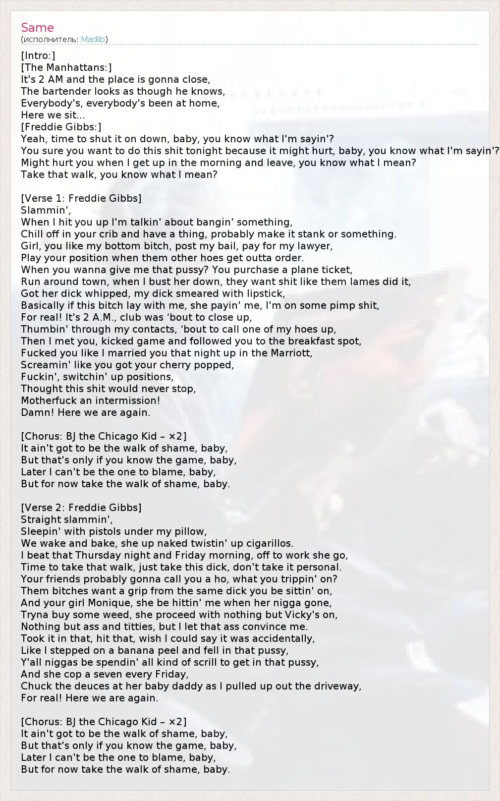 [Intro:] [The Manhattans:] It's 2 AM and the place is gonna close, The bartender looks as though he knows, Everybody's, everybody's been at home, Here we sit... [Freddie Gibbs:] Yeah, time to shut it on down, baby, you know what I'm sayin'? You sure you want to do this shit tonight because it might hurt, baby, you know what I'm sayin'? Might hurt you when I get up in the morning and leave, you know what I mean? Take that walk, you know what I mean? [Verse 1: Freddie Gibbs] Slammin', When I hit you up I'm talkin' about bangin' something, Chill off in your crib and have a thing, probably make it stank or something. Girl, you like my bottom bitch, post my bail, pay for my lawyer, Play your position when them other hoes get outta order. When you wanna give me that pussy? You purchase a plane ticket, Run around town, when I bust her down, they want shit like them lames did it, Got her dick whipped, my dick smeared with lipstick, Basically if this bitch lay with me, she payin' me, I'm on some pimp shit, For real! It's 2 A.M., club was ‘bout to close up, Thumbin' through my contacts, ‘bout to call one of my hoes up, Then I met you, kicked game and followed you to the breakfast spot, Fucked you like I married you that night up in the Marriott, Screamin' like you got your cherry popped, Fuckin', switchin' up positions, Thought this shit would never stop, Motherfuck an intermission! Damn! Here we are again. [Chorus: BJ the Chicago Kid – ×2] It ain't got to be the walk of shame, baby, But that's only if you know the game, baby, Later I can't be the one to blame, baby, But for now take the walk of shame, baby. [Verse 2: Freddie Gibbs] Straight slammin', Sleepin' with pistols under my pillow, We wake and bake, she up naked twistin' up cigarillos. I beat that Thursday night and Friday morning, off to work she go, Time to take that walk, just take this dick, don't take it personal. Your friends probably gonna call you a ho, what you trippin' on? Them bitches want a grip from the same dick you be sittin' on, And your girl Monique, she be hittin' me when her nigga gone, Tryna buy some weed, she proceed with nothing but Vicky's on, Nothing but ass and titties, but I let that ass convince me. Took it in that, hit that, wish I could say it was accidentally, Like I stepped on a banana peel and fell in that pussy, Y'all niggas be spendin' all kind of scrill to get in that pussy, And she cop a seven every Friday, Chuck the deuces at her baby daddy as I pulled up out the driveway, For real! Here we are again. [Chorus: BJ the Chicago Kid – ×2] It ain't got to be the walk of shame, baby, But that's only if you know the game, baby, Later I can't be the one to blame, baby, But for now take the walk of shame, baby.