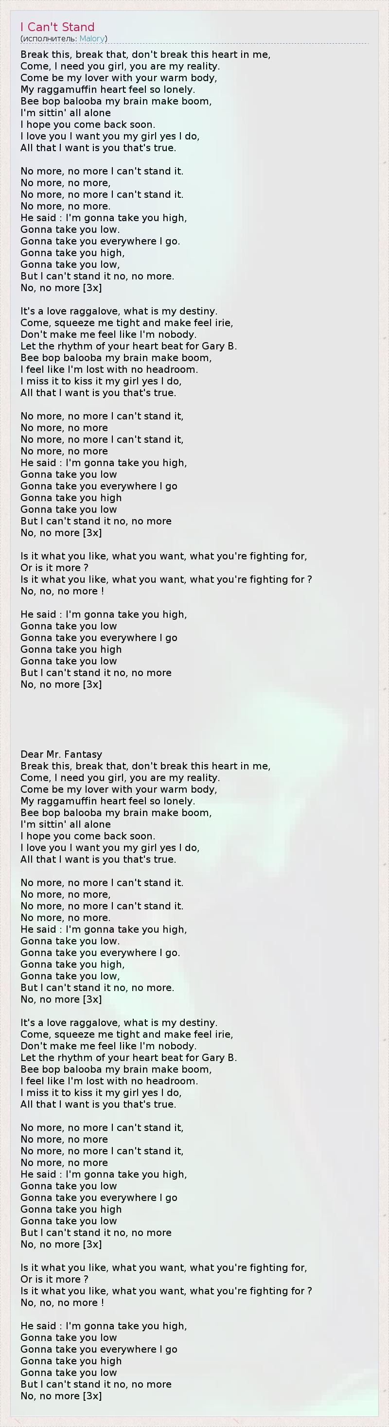 Break this, break that, don't break this heart in me, Come, I need you girl, you are my reality. Come be my lover with your warm body, My raggamuffin heart feel so lonely. Bee bop balooba my brain make boom, I'm sittin' all alone I hope you come back soon. I love you I want you my girl yes I do, All that I want is you that's true. No more, no more I can't stand it. No more, no more, No more, no more I can't stand it. No more, no more. He said : I'm gonna take you high, Gonna take you low. Gonna take you everywhere I go. Gonna take you high, Gonna take you low, But I can't stand it no, no more. No, no more [3x] It's a love raggalove, what is my destiny. Come, squeeze me tight and make feel irie, Don't make me feel like I'm nobody. Let the rhythm of your heart beat for Gary B. Bee bop balooba my brain make boom, I feel like I'm lost with no headroom. I miss it to kiss it my girl yes I do, All that I want is you that's true. No more, no more I can't stand it, No more, no more No more, no more I can't stand it, No more, no more He said : I'm gonna take you high, Gonna take you low Gonna take you everywhere I go Gonna take you high Gonna take you low But I can't stand it no, no more No, no more [3x] Is it what you like, what you want, what you're fighting for, Or is it more ? Is it what you like, what you want, what you're fighting for ? No, no, no more ! He said : I'm gonna take you high, Gonna take you low Gonna take you everywhere I go Gonna take you high Gonna take you low But I can't stand it no, no more No, no more [3x] Dear Mr. Fantasy Break this, break that, don't break this heart in me, Come, I need you girl, you are my reality. Come be my lover with your warm body, My raggamuffin heart feel so lonely. Bee bop balooba my brain make boom, I'm sittin' all alone I hope you come back soon. I love you I want you my girl yes I do, All that I want is you that's true. No more, no more I can't stand it. No more, no more, No more, no more I can't stand it. No more, no more. He said : I'm gonna take you high, Gonna take you low. Gonna take you everywhere I go. Gonna take you high, Gonna take you low, But I can't stand it no, no more. No, no more [3x] It's a love raggalove, what is my destiny. Come, squeeze me tight and make feel irie, Don't make me feel like I'm nobody. Let the rhythm of your heart beat for Gary B. Bee bop balooba my brain make boom, I feel like I'm lost with no headroom. I miss it to kiss it my girl yes I do, All that I want is you that's true. No more, no more I can't stand it, No more, no more No more, no more I can't stand it, No more, no more He said : I'm gonna take you high, Gonna take you low Gonna take you everywhere I go Gonna take you high Gonna take you low But I can't stand it no, no more No, no more [3x] Is it what you like, what you want, what you're fighting for, Or is it more ? Is it what you like, what you want, what you're fighting for ? No, no, no more ! He said : I'm gonna take you high, Gonna take you low Gonna take you everywhere I go Gonna take you high Gonna take you low But I can't stand it no, no more No, no more [3x]