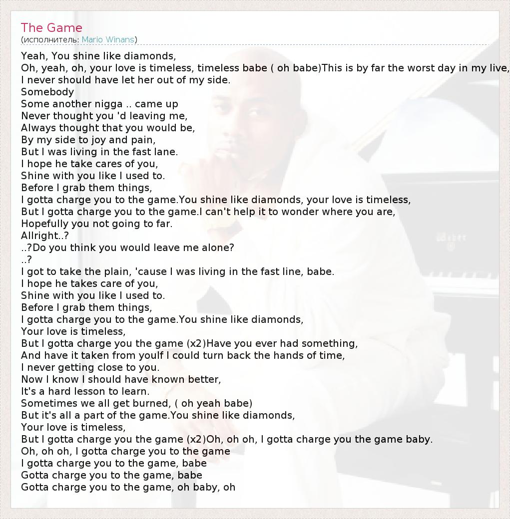 Yeah, You shine like diamonds, Oh, yeah, oh, your love is timeless, timeless babe ( oh babe)This is by far the worst day in my live, I never should have let her out of my side. Somebody Some another nigga .. came up Never thought you 'd leaving me, Always thought that you would be, By my side to joy and pain, But I was living in the fast lane. I hope he take cares of you, Shine with you like I used to. Before I grab them things, I gotta charge you to the game.You shine like diamonds, your love is timeless, But I gotta charge you to the game.I can't help it to wonder where you are, Hopefully you not going to far. Allright..? ..?Do you think you would leave me alone? ..? I got to take the plain, 'cause I was living in the fast line, babe. I hope he takes care of you, Shine with you like I used to. Before I grab them things, I gotta charge you to the game.You shine like diamonds, Your love is timeless, But I gotta charge you the game (x2)Have you ever had something, And have it taken from youIf I could turn back the hands of time, I never getting close to you. Now I know I should have known better, It's a hard lesson to learn. Sometimes we all get burned, ( oh yeah babe) But it's all a part of the game.You shine like diamonds, Your love is timeless, But I gotta charge you the game (x2)Oh, oh oh, I gotta charge you the game baby. Oh, oh oh, I gotta charge you to the game I gotta charge you to the game, babe Gotta charge you to the game, babe Gotta charge you to the game, oh baby, oh