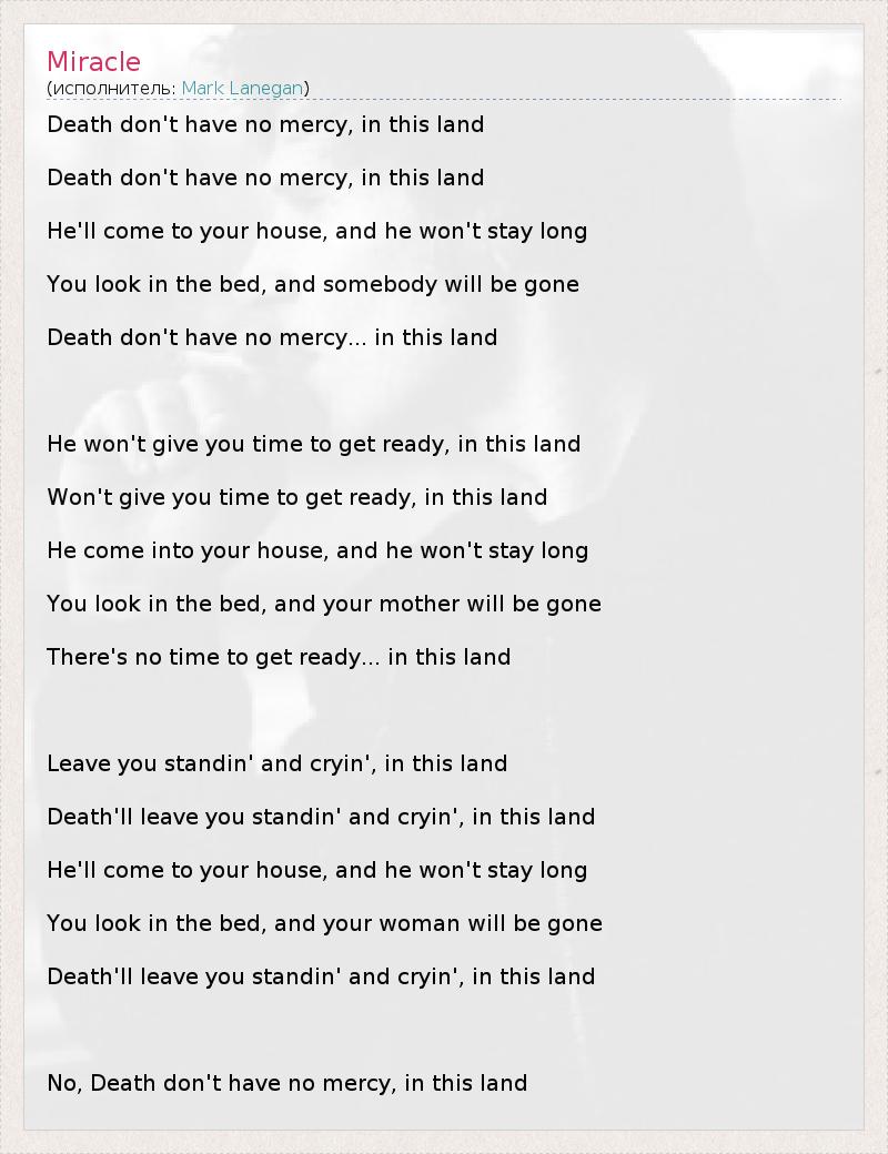 Death don't have no mercy, in this land Death don't have no mercy, in this land He'll come to your house, and he won't stay long You look in the bed, and somebody will be gone Death don't have no mercy... in this land He won't give you time to get ready, in this land Won't give you time to get ready, in this land He come into your house, and he won't stay long You look in the bed, and your mother will be gone There's no time to get ready... in this land Leave you standin' and cryin', in this land Death'll leave you standin' and cryin', in this land He'll come to your house, and he won't stay long You look in the bed, and your woman will be gone Death'll leave you standin' and cryin', in this land No, Death don't have no mercy, in this land