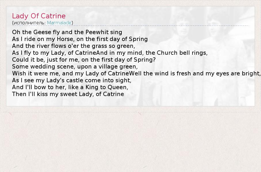 Oh the Geese fly and the Peewhit sing As I ride on my Horse, on the first day of Spring And the river flows o'er the grass so green, As I fly to my Lady, of CatrineAnd in my mind, the Church bell rings, Could it be, just for me, on the first day of Spring? Some wedding scene, upon a village green, Wish it were me, and my Lady of CatrineWell the wind is fresh and my eyes are bright, As I see my Lady's castle come into sight, And I'll bow to her, like a King to Queen, Then I'll kiss my sweet Lady, of Catrine