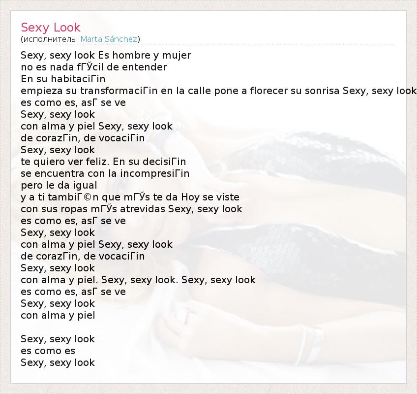 Sexy, sexy look Es hombre y mujer no es nada fГЎcil de entender En su habitaciГіn empieza su transformaciГіn en la calle pone a florecer su sonrisa Sexy, sexy look es como es, asГ se ve Sexy, sexy look con alma y piel Sexy, sexy look de corazГіn, de vocaciГіn Sexy, sexy look te quiero ver feliz. En su decisiГіn se encuentra con la incompresiГіn pero le da igual y a ti tambiГ©n que mГЎs te da Hoy se viste con sus ropas mГЎs atrevidas Sexy, sexy look es como es, asГ se ve Sexy, sexy look con alma y piel Sexy, sexy look de corazГіn, de vocaciГіn Sexy, sexy look con alma y piel. Sexy, sexy look. Sexy, sexy look es como es, asГ se ve Sexy, sexy look con alma y piel Sexy, sexy look es como es Sexy, sexy look