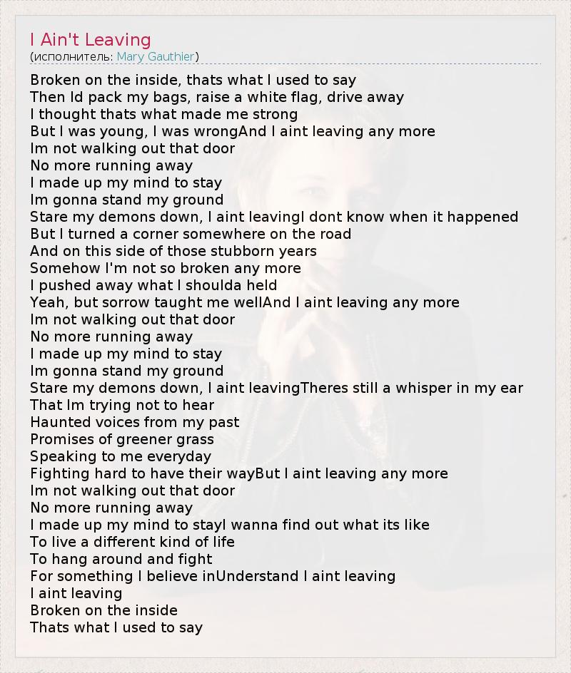 Broken on the inside, thats what I used to say Then Id pack my bags, raise a white flag, drive away I thought thats what made me strong But I was young, I was wrongAnd I aint leaving any more Im not walking out that door No more running away I made up my mind to stay Im gonna stand my ground Stare my demons down, I aint leavingI dont know when it happened But I turned a corner somewhere on the road And on this side of those stubborn years Somehow I'm not so broken any more I pushed away what I shoulda held Yeah, but sorrow taught me wellAnd I aint leaving any more Im not walking out that door No more running away I made up my mind to stay Im gonna stand my ground Stare my demons down, I aint leavingTheres still a whisper in my ear That Im trying not to hear Haunted voices from my past Promises of greener grass Speaking to me everyday Fighting hard to have their wayBut I aint leaving any more Im not walking out that door No more running away I made up my mind to stayI wanna find out what its like To live a different kind of life To hang around and fight For something I believe inUnderstand I aint leaving I aint leaving Broken on the inside Thats what I used to say