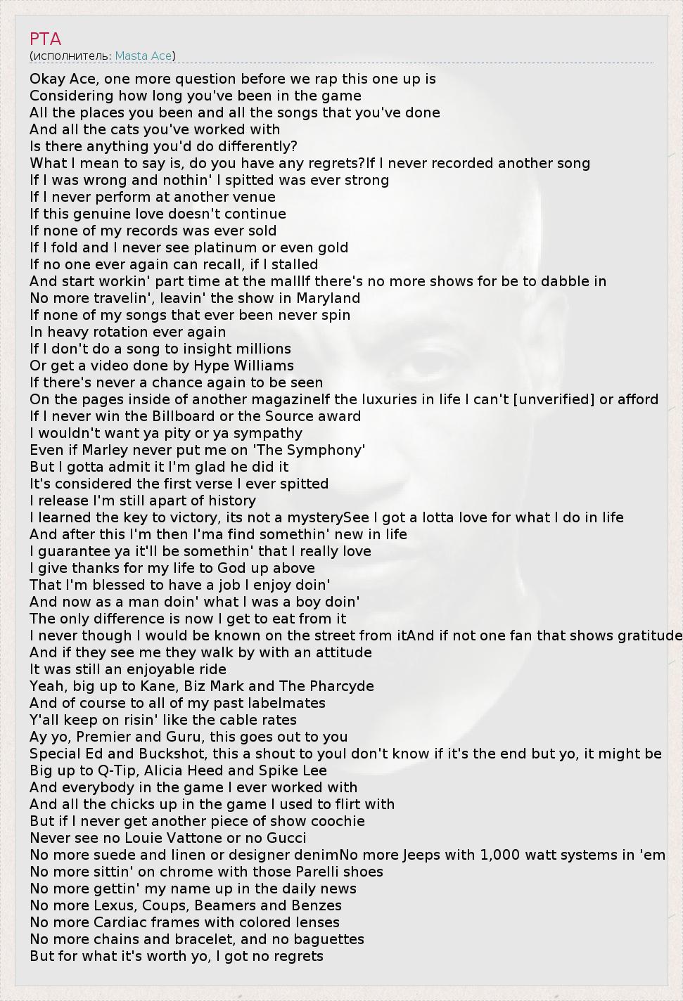 Это интересно:Masta Ace - 25 лет классики, не меняя стиля.Его музыкальная карьера начиналась в 80х, когда Эйс крутился около набиравшей обороты Juice Crew. Первый заметный трек - один из величайших posse cut'ов рэп-музыки The Symphony, записанный в 1988-м вместе с Big Daddy Kane, Kool G. Rap и Craig G - сразу вознес его на хип-хоп-Олимп и приказал не спускаться... продолжение