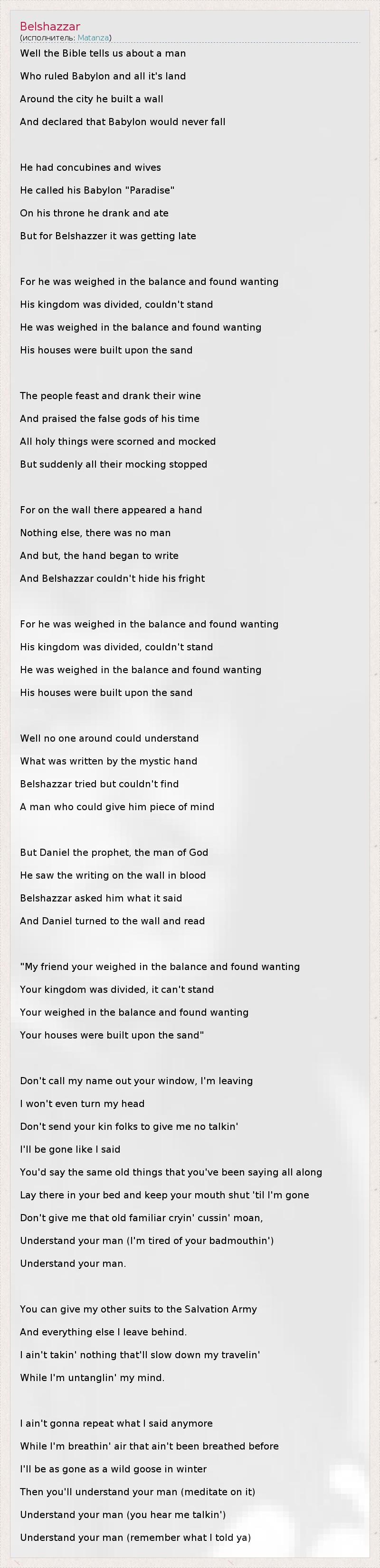 А как ты думаешь, о чем песня "Belshazzar" ?