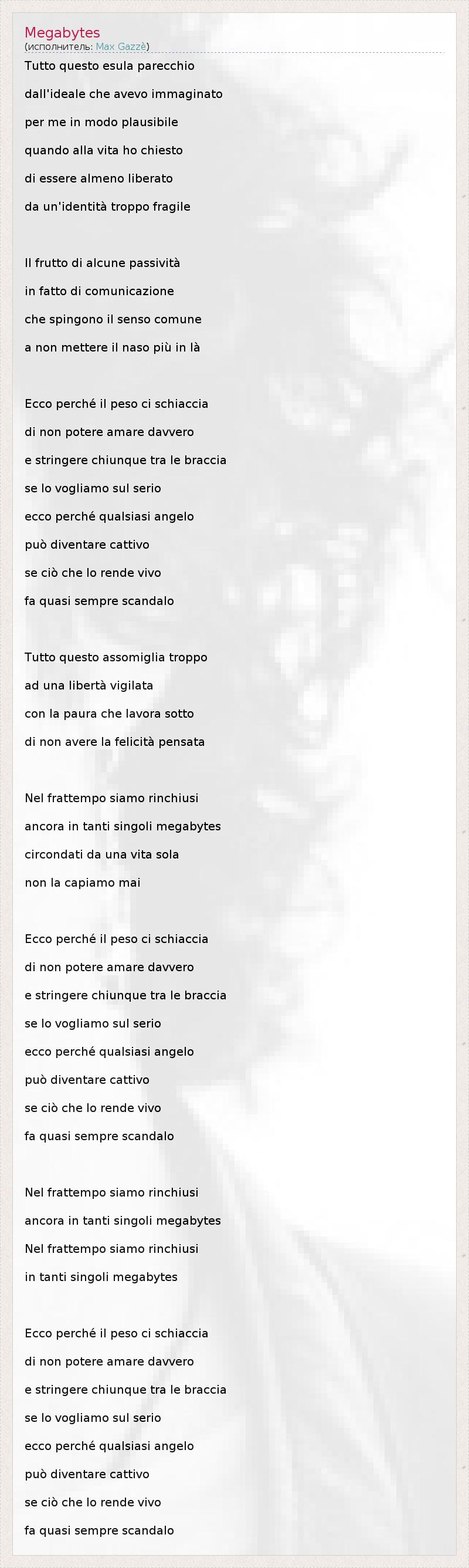 Tutto questo esula parecchio dall'ideale che avevo immaginato per me in modo plausibile quando alla vita ho chiesto di essere almeno liberato da un'identità troppo fragile Il frutto di alcune passività in fatto di comunicazione che spingono il senso comune a non mettere il naso più in là Ecco perché il peso ci schiaccia di non potere amare davvero e stringere chiunque tra le braccia se lo vogliamo sul serio ecco perché qualsiasi angelo può diventare cattivo se ciò che lo rende vivo fa quasi sempre scandalo Tutto questo assomiglia troppo ad una libertà vigilata con la paura che lavora sotto di non avere la felicità pensata Nel frattempo siamo rinchiusi ancora in tanti singoli megabytes circondati da una vita sola non la capiamo mai Ecco perché il peso ci schiaccia di non potere amare davvero e stringere chiunque tra le braccia se lo vogliamo sul serio ecco perché qualsiasi angelo può diventare cattivo se ciò che lo rende vivo fa quasi sempre scandalo Nel frattempo siamo rinchiusi ancora in tanti singoli megabytes Nel frattempo siamo rinchiusi in tanti singoli megabytes Ecco perché il peso ci schiaccia di non potere amare davvero e stringere chiunque tra le braccia se lo vogliamo sul serio ecco perché qualsiasi angelo può diventare cattivo se ciò che lo rende vivo fa quasi sempre scandalo