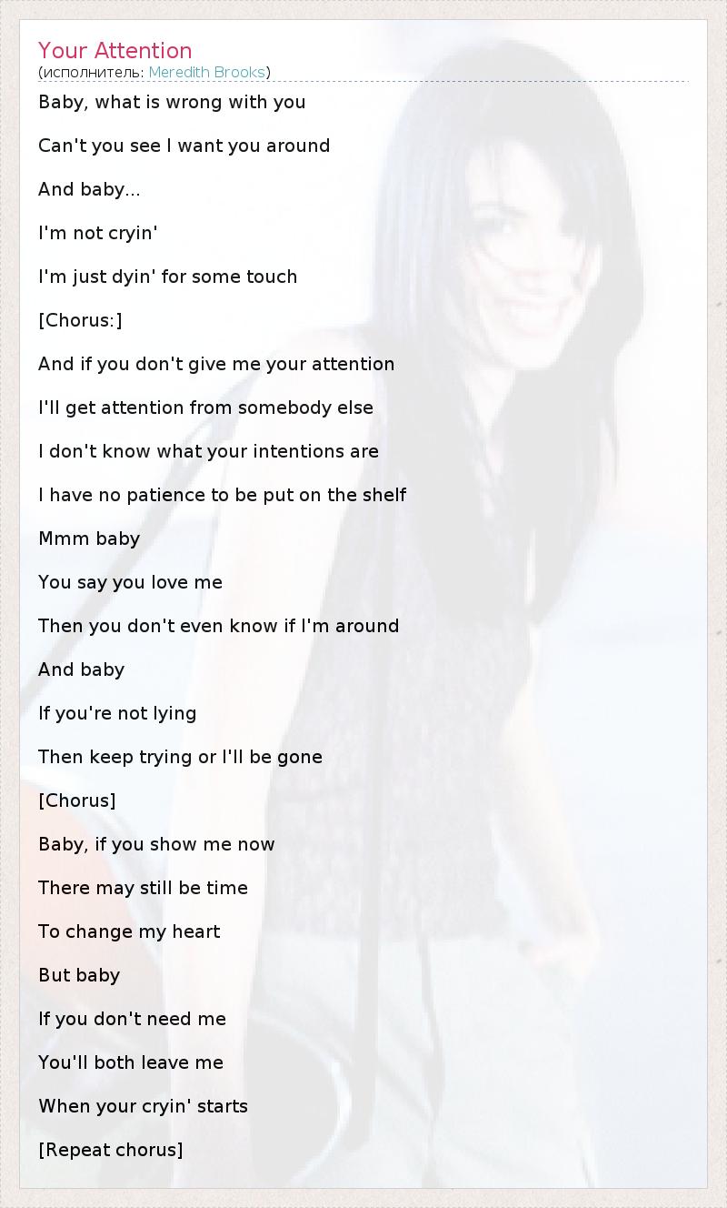 Baby, what is wrong with you Can't you see I want you around And baby... I'm not cryin' I'm just dyin' for some touch [Chorus:] And if you don't give me your attention I'll get attention from somebody else I don't know what your intentions are I have no patience to be put on the shelf Mmm baby You say you love me Then you don't even know if I'm around And baby If you're not lying Then keep trying or I'll be gone [Chorus] Baby, if you show me now There may still be time To change my heart But baby If you don't need me You'll both leave me When your cryin' starts [Repeat chorus]