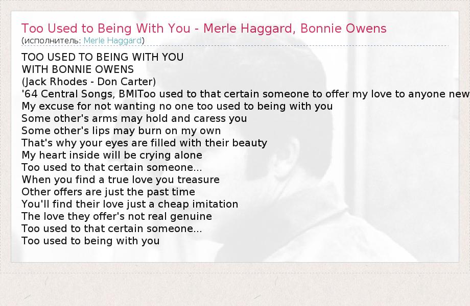 TOO USED TO BEING WITH YOU WITH BONNIE OWENS (Jack Rhodes - Don Carter) '64 Central Songs, BMIToo used to that certain someone to offer my love to anyone new My excuse for not wanting no one too used to being with you Some other's arms may hold and caress you Some other's lips may burn on my own That's why your eyes are filled with their beauty My heart inside will be crying alone Too used to that certain someone... When you find a true love you treasure Other offers are just the past time You'll find their love just a cheap imitation The love they offer's not real genuine Too used to that certain someone... Too used to being with you