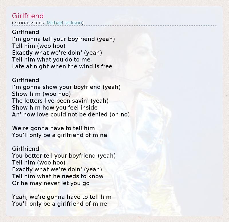 Girlfriend I'm gonna tell your boyfriend (yeah) Tell him (woo hoo) Exactly what we're doin' (yeah) Tell him what you do to me Late at night when the wind is free Girlfriend I'm gonna show your boyfriend (yeah) Show him (woo hoo) The letters I've been savin' (yeah) Show him how you feel inside An' how love could not be denied (oh no) We're gonna have to tell him You'll only be a girlfriend of mine Girlfriend You better tell your boyfriend (yeah) Tell him (woo hoo) Exactly what we're doin' (yeah) Tell him what he needs to know Or he may never let you go Yeah, we're gonna have to tell him You'll only be a girlfriend of mine