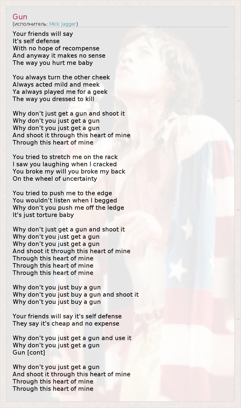 Your friends will say It's self defense With no hope of recompense And anyway it makes no sense The way you hurt me baby You always turn the other cheek Always acted mild and meek Ya always played me for a geek The way you dressed to kill Why don't just get a gun and shoot it Why don't you just get a gun Why don't you just get a gun And shoot it through this heart of mine Through this heart of mine You tried to stretch me on the rack I saw you laughing when I cracked You broke my will you broke my back On the wheel of uncertainty You tried to push me to the edge You wouldn't listen when I begged Why don't you push me off the ledge It's just torture baby Why don't just get a gun and shoot it Why don't you just get a gun Why don't you just get a gun And shoot it through this heart of mine Through this heart of mine Through this heart of mine Through this heart of mine Why don't you just buy a gun Why don't you just buy a gun and shoot it Why don't you just buy a gun Your friends will say it's self defense They say it's cheap and no expense Why don't you just get a gun and use it Why don't you just get a gun Gun [cont] Why don't you just get a gun And shoot it through this heart of mine Through this heart of mine Through this heart of mine