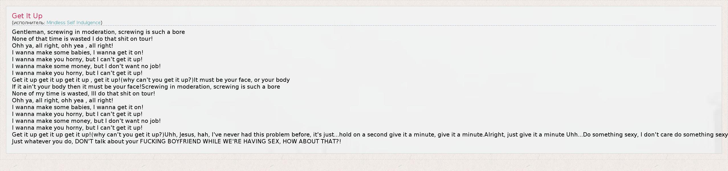 Gentleman, screwing in moderation, screwing is such a bore None of that time is wasted I do that shit on tour! Ohh ya, all right, ohh yea , all right! I wanna make some babies, I wanna get it on! I wanna make you horny, but I can't get it up! I wanna make some money, but I don't want no job! I wanna make you horny, but I can't get it up! Get it up get it up get it up , get it up!(why can't you get it up?)It must be your face, or your body If it ain't your body then it must be your face!Screwing in moderation, screwing is such a bore None of my time is wasted, Ill do that shit on tour! Ohh ya, all right, ohh yea , all right! I wanna make some babies, I wanna get it on! I wanna make you horny, but I can't get it up! I wanna make some money, but I don't want no job! I wanna make you horny, but I can't get it up! Get it up get it up get it up!(why can't you get it up?)Uhh, Jesus, hah, I've never had this problem before, it's just...hold on a second give it a minute, give it a minute.Alright, just give it a minute Uhh...Do something sexy, I don't care do something sexy Just whatever you do, DON'T talk about your FUCKING BOYFRIEND WHILE WE'RE HAVING SEX, HOW ABOUT THAT?!