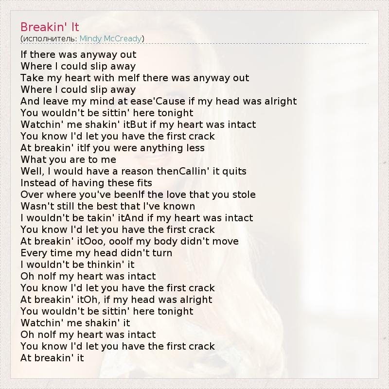 If there was anyway out Where I could slip away Take my heart with meIf there was anyway out Where I could slip away And leave my mind at ease'Cause if my head was alright You wouldn't be sittin' here tonight Watchin' me shakin' itBut if my heart was intact You know I'd let you have the first crack At breakin' itIf you were anything less What you are to me Well, I would have a reason thenCallin' it quits Instead of having these fits Over where you've beenIf the love that you stole Wasn't still the best that I've known I wouldn't be takin' itAnd if my heart was intact You know I'd let you have the first crack At breakin' itOoo, oooIf my body didn't move Every time my head didn't turn I wouldn't be thinkin' it Oh noIf my heart was intact You know I'd let you have the first crack At breakin' itOh, if my head was alright You wouldn't be sittin' here tonight Watchin' me shakin' it Oh noIf my heart was intact You know I'd let you have the first crack At breakin' it