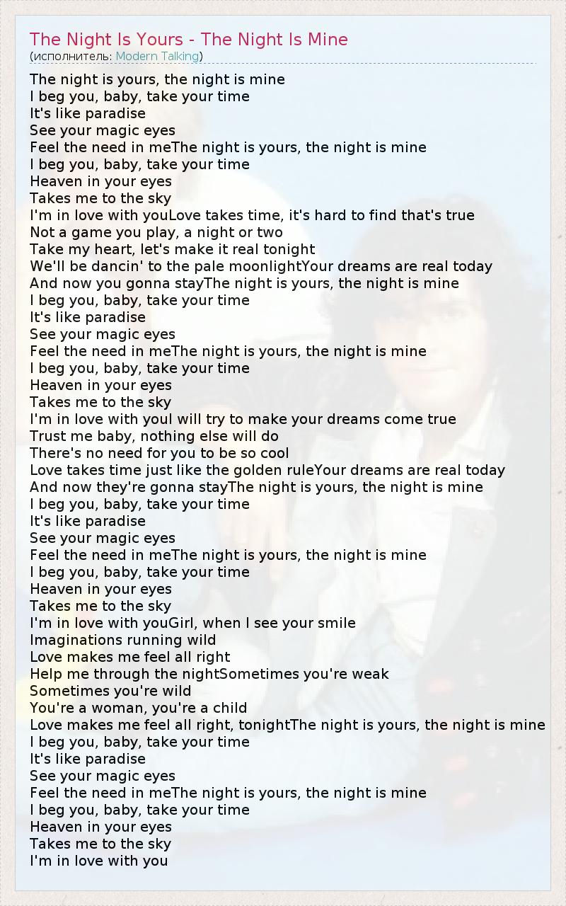 А как ты думаешь, о чем песня "The Night Is Yours - The Night Is Mine" ?