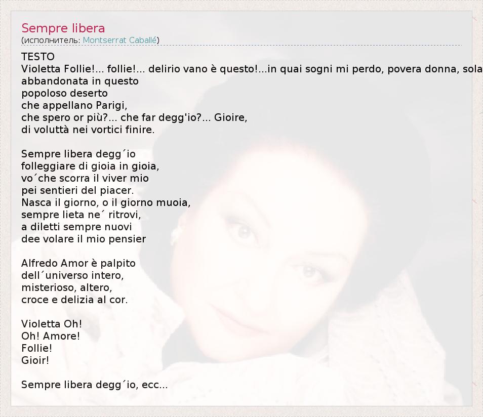 TESTO Violetta Follie!... follie!... delirio vano è questo!...in quai sogni mi perdo, povera donna, sola abbandonata in questo popoloso deserto che appellano Parigi, che spero or più?... che far degg'io?... Gioire, di voluttà nei vortici finire. Sempre libera degg´io folleggiare di gioia in gioia, vo´che scorra il viver mio pei sentieri del piacer. Nasca il giorno, o il giorno muoia, sempre lieta ne´ ritrovi, a diletti sempre nuovi dee volare il mio pensier Alfredo Amor è palpito dell´universo intero, misterioso, altero, croce e delizia al cor. Violetta Oh! Oh! Amore! Follie! Gioir! Sempre libera degg´io, ecc...