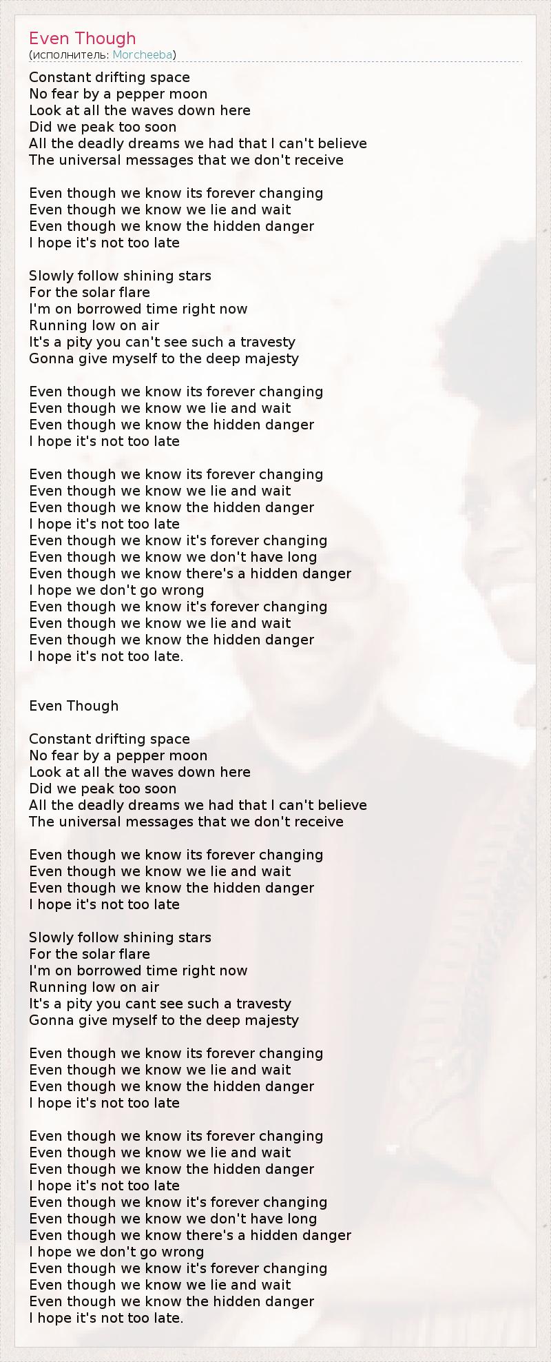 Constant drifting space No fear by a pepper moon Look at all the waves down here Did we peak too soon All the deadly dreams we had that I can't believe The universal messages that we don't receive Even though we know its forever changing Even though we know we lie and wait Even though we know the hidden danger I hope it's not too late Slowly follow shining stars For the solar flare I'm on borrowed time right now Running low on air It's a pity you can't see such a travesty Gonna give myself to the deep majesty Even though we know its forever changing Even though we know we lie and wait Even though we know the hidden danger I hope it's not too late Even though we know its forever changing Even though we know we lie and wait Even though we know the hidden danger I hope it's not too late Even though we know it's forever changing Even though we know we don't have long Even though we know there's a hidden danger I hope we don't go wrong Even though we know it's forever changing Even though we know we lie and wait Even though we know the hidden danger I hope it's not too late. Even Though Constant drifting space No fear by a pepper moon Look at all the waves down here Did we peak too soon All the deadly dreams we had that I can't believe The universal messages that we don't receive Even though we know its forever changing Even though we know we lie and wait Even though we know the hidden danger I hope it's not too late Slowly follow shining stars For the solar flare I'm on borrowed time right now Running low on air It's a pity you cant see such a travesty Gonna give myself to the deep majesty Even though we know its forever changing Even though we know we lie and wait Even though we know the hidden danger I hope it's not too late Even though we know its forever changing Even though we know we lie and wait Even though we know the hidden danger I hope it's not too late Even though we know it's forever changing Even though we know we don't have long Even though we know there's a hidden danger I hope we don't go wrong Even though we know it's forever changing Even though we know we lie and wait Even though we know the hidden danger I hope it's not too late.