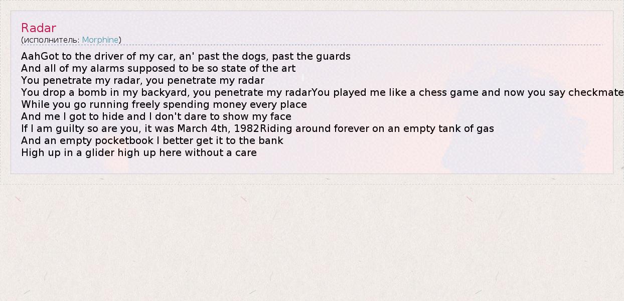 Это интересно:Пожалуй, Morphine суждено остаться одной из самых глубоких и в тоже время загадочных групп 90-х годов. Эта американская команда, исполняющая мрачную, местами откровенно абстинентно-депрессивную музыку, всю жизнь провела в глубокой тени, при этом умудряясь сохранять поистине культовый статус у немногочисленных, но верных поклонников. Неизвестно, как бы повернулась история команды, если бы... продолжение