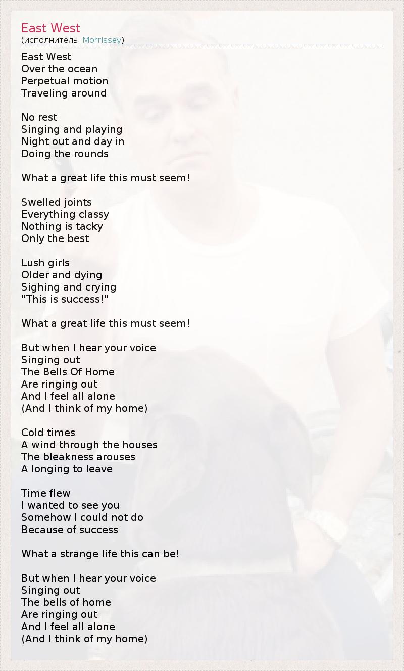 East West Over the ocean Perpetual motion Traveling around No rest Singing and playing Night out and day in Doing the rounds What a great life this must seem! Swelled joints Everything classy Nothing is tacky Only the best Lush girls Older and dying Sighing and crying "This is success!" What a great life this must seem! But when I hear your voice Singing out The Bells Of Home Are ringing out And I feel all alone (And I think of my home) Cold times A wind through the houses The bleakness arouses A longing to leave Time flew I wanted to see you Somehow I could not do Because of success What a strange life this can be! But when I hear your voice Singing out The bells of home Are ringing out And I feel all alone (And I think of my home)