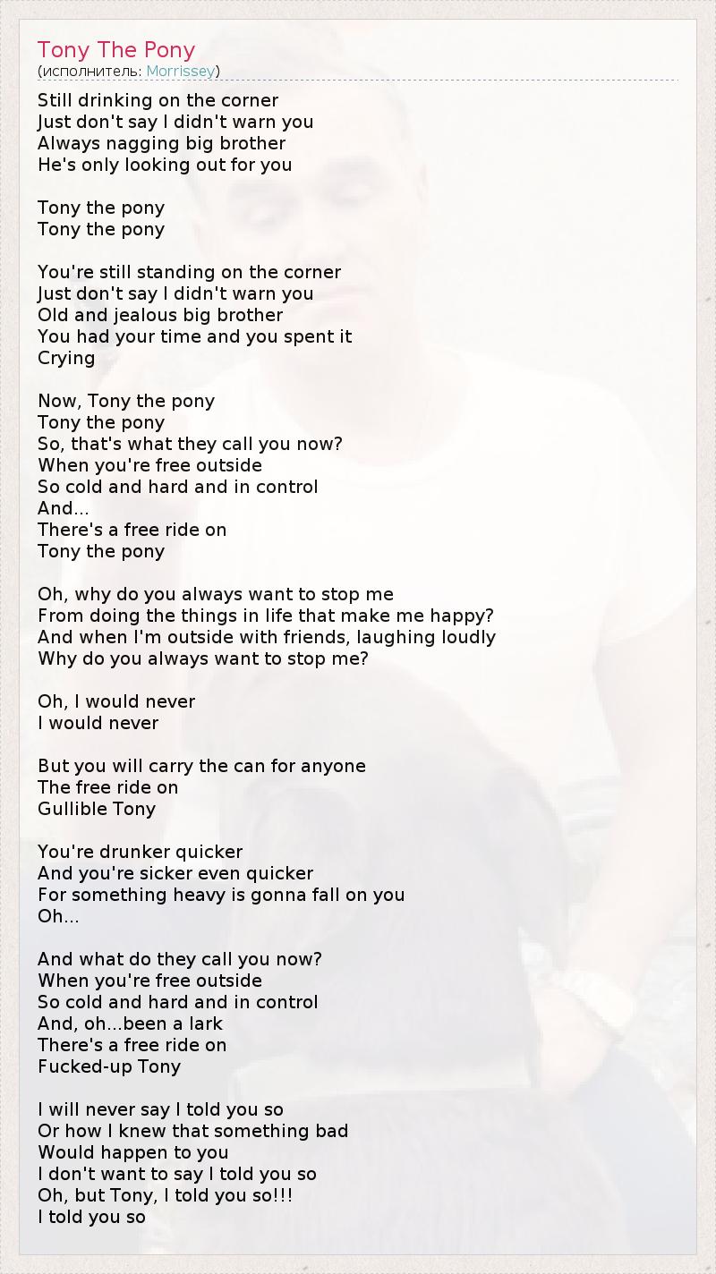 Still drinking on the corner Just don't say I didn't warn you Always nagging big brother He's only looking out for you Tony the pony Tony the pony You're still standing on the corner Just don't say I didn't warn you Old and jealous big brother You had your time and you spent it Crying Now, Tony the pony Tony the pony So, that's what they call you now? When you're free outside So cold and hard and in control And... There's a free ride on Tony the pony Oh, why do you always want to stop me From doing the things in life that make me happy? And when I'm outside with friends, laughing loudly Why do you always want to stop me? Oh, I would never I would never But you will carry the can for anyone The free ride on Gullible Tony You're drunker quicker And you're sicker even quicker For something heavy is gonna fall on you Oh... And what do they call you now? When you're free outside So cold and hard and in control And, oh...been a lark There's a free ride on Fucked-up Tony I will never say I told you so Or how I knew that something bad Would happen to you I don't want to say I told you so Oh, but Tony, I told you so!!! I told you so