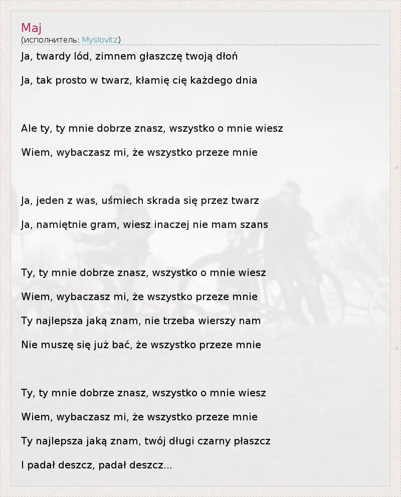 Это интересно:Myslovitz — польская рок-группа образована в 1992 в городе Мысловице. Название группы — это немецкое название данного города.Артур Ройек образовал группу в 1992 году. Она завоевала несколько призов на фестивалях, после чего группа подписала контракт с издательством MJM Music Polska. В 1995 году группа выпустила альбом Myslovitz, хорошо принятый критиками. Продюсером был Ян Гаррис, ранее известный по сотрудничеству... продолжение