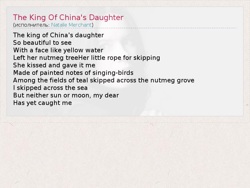 А как ты думаешь, о чем песня "The King Of China's Daughter" ?