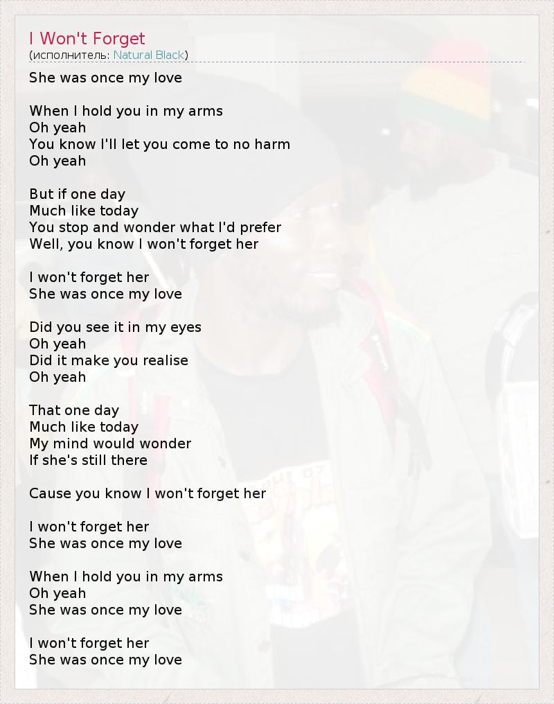 Однажды (когда-то) она была моей любовью Когда я держу тебя в своих объятиях, О, да Ты знаешь, что я не причиню тебе вреда О, да Но если однажды, Более, чем сейчас, Ты остановишься и задумаешься, Что бы я предпочел? Да, я не забуду её Я не забуду её, Она была моей любовью Видела ли ты это в моих глазах? О, да Заставило ли это тебя осознать, О, да Что однажды, Более, чем сейчас, Мне будет интересно Здесь ли она до сих пор? Потому что ты знаешь, что я не забуду её. Я не забуду её, Она была моей любовью Когда я держу тебя в своих объятиях, О, да Однажды она была моей любовью. Я не забуду её, Она была моей любовью