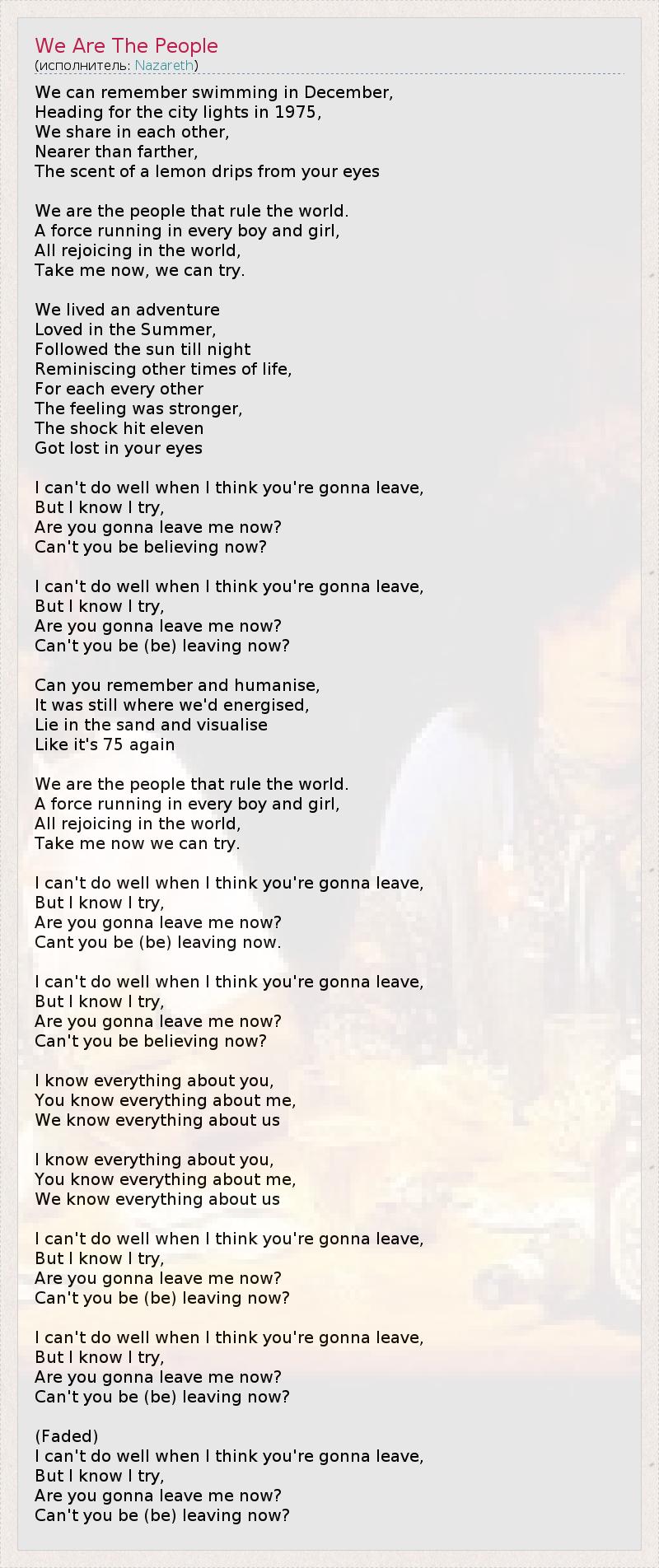 We can remember swimming in December, Heading for the city lights in 1975, We share in each other, Nearer than farther, The scent of a lemon drips from your eyes We are the people that rule the world. A force running in every boy and girl, All rejoicing in the world, Take me now, we can try. We lived an adventure Loved in the Summer, Followed the sun till night Reminiscing other times of life, For each every other The feeling was stronger, The shock hit eleven Got lost in your eyes I can't do well when I think you're gonna leave, But I know I try, Are you gonna leave me now? Can't you be believing now? I can't do well when I think you're gonna leave, But I know I try, Are you gonna leave me now? Can't you be (be) leaving now? Can you remember and humanise, It was still where we'd energised, Lie in the sand and visualise Like it's 75 again We are the people that rule the world. A force running in every boy and girl, All rejoicing in the world, Take me now we can try. I can't do well when I think you're gonna leave, But I know I try, Are you gonna leave me now? Cant you be (be) leaving now. I can't do well when I think you're gonna leave, But I know I try, Are you gonna leave me now? Can't you be believing now? I know everything about you, You know everything about me, We know everything about us I know everything about you, You know everything about me, We know everything about us I can't do well when I think you're gonna leave, But I know I try, Are you gonna leave me now? Can't you be (be) leaving now? I can't do well when I think you're gonna leave, But I know I try, Are you gonna leave me now? Can't you be (be) leaving now? (Faded) I can't do well when I think you're gonna leave, But I know I try, Are you gonna leave me now? Can't you be (be) leaving now?