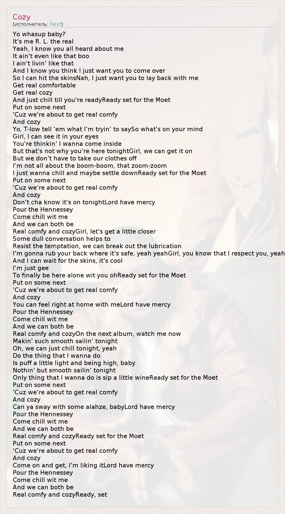 Это интересно:Next - это американская R&B группа, которая была популярна в конце 90-ых. Самые известные их песни - "Too Close", "Wifey" и "I Still Love You". Всего выпустили 3 студийных альбома.