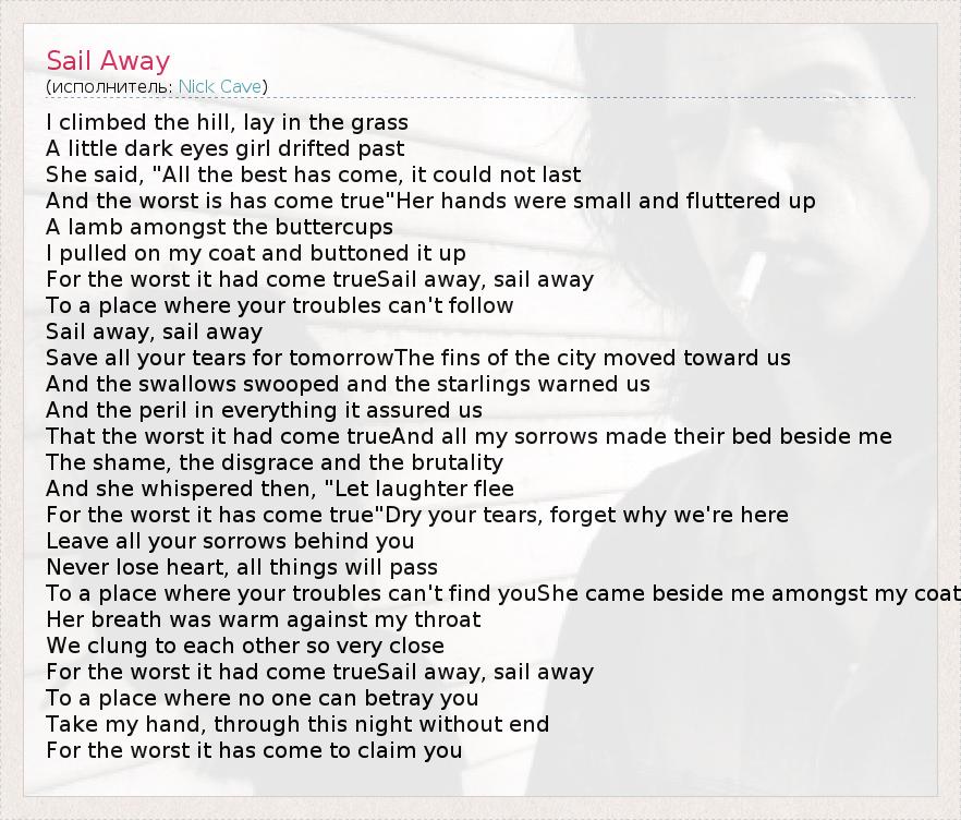 I climbed the hill, lay in the grass A little dark eyes girl drifted past She said, "All the best has come, it could not last And the worst is has come true"Her hands were small and fluttered up A lamb amongst the buttercups I pulled on my coat and buttoned it up For the worst it had come trueSail away, sail away To a place where your troubles can't follow Sail away, sail away Save all your tears for tomorrowThe fins of the city moved toward us And the swallows swooped and the starlings warned us And the peril in everything it assured us That the worst it had come trueAnd all my sorrows made their bed beside me The shame, the disgrace and the brutality And she whispered then, "Let laughter flee For the worst it has come true"Dry your tears, forget why we're here Leave all your sorrows behind you Never lose heart, all things will pass To a place where your troubles can't find youShe came beside me amongst my coat Her breath was warm against my throat We clung to each other so very close For the worst it had come trueSail away, sail away To a place where no one can betray you Take my hand, through this night without end For the worst it has come to claim you