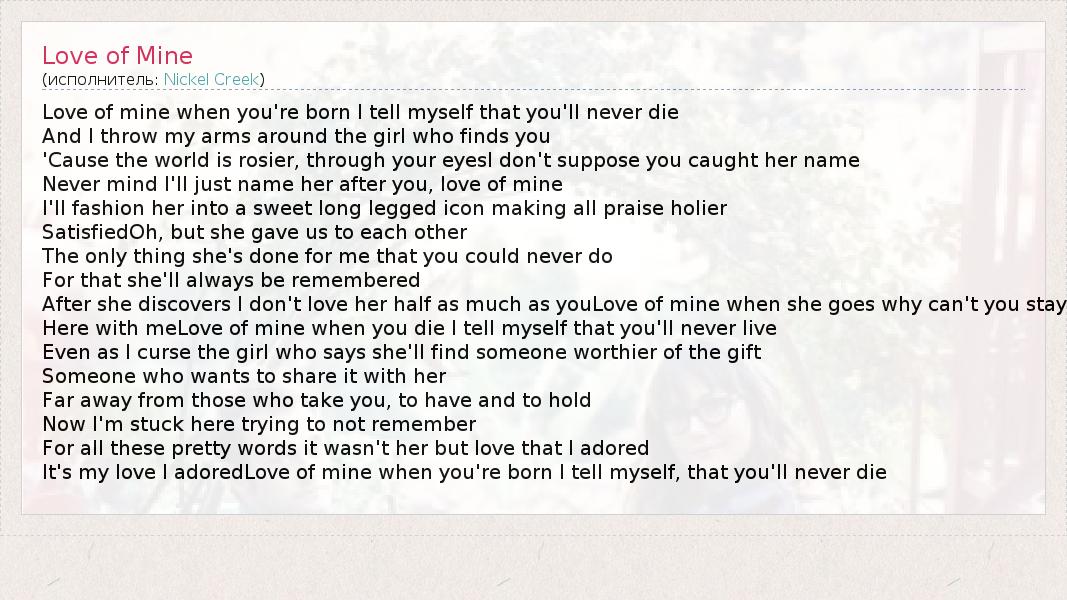 А как ты думаешь, о чем песня "Love of Mine" ?