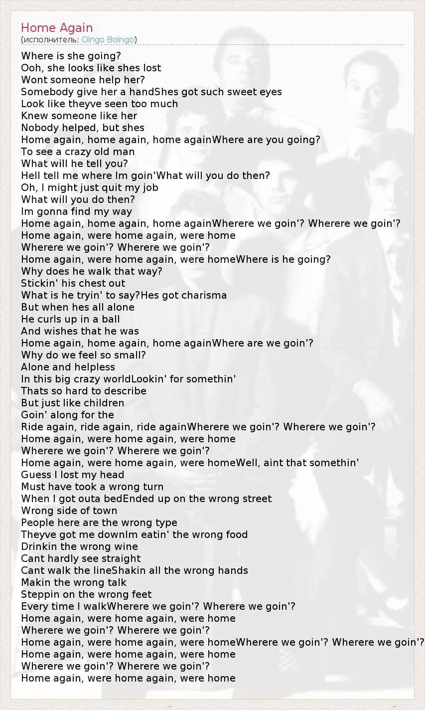 Home again, were home again, were homeWherere we goin'? Wherere we goin'?