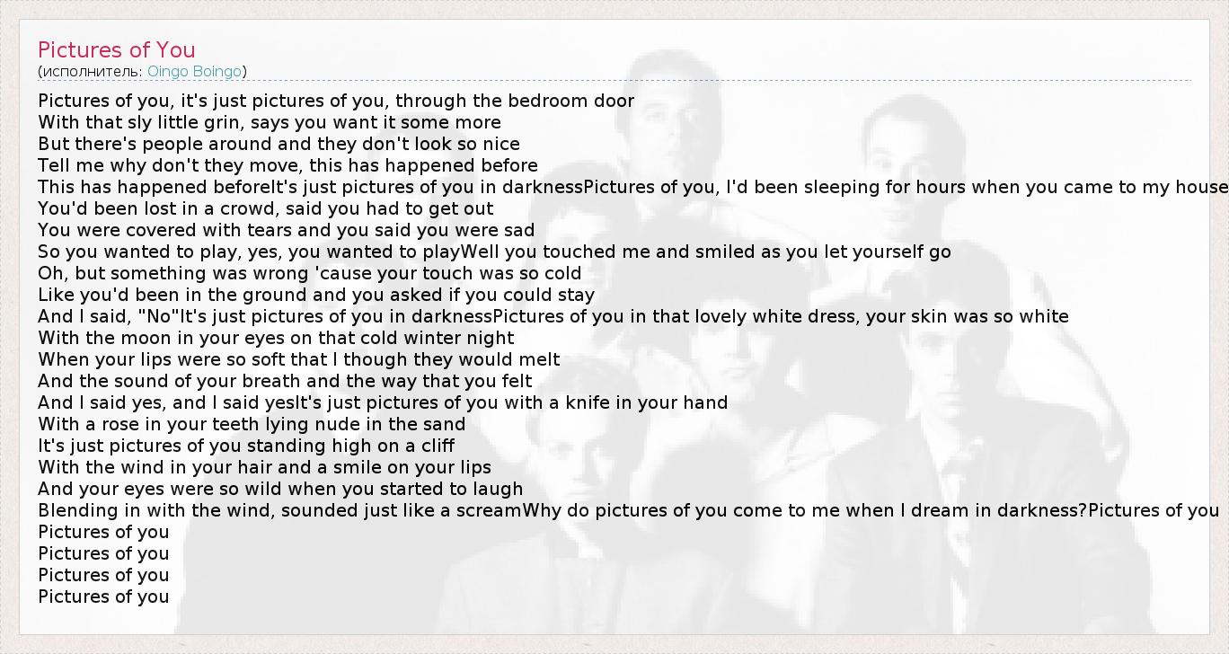 This has happened beforeIt's just pictures of you in darknessPictures of you, I'd been sleeping for hours when you came to my house