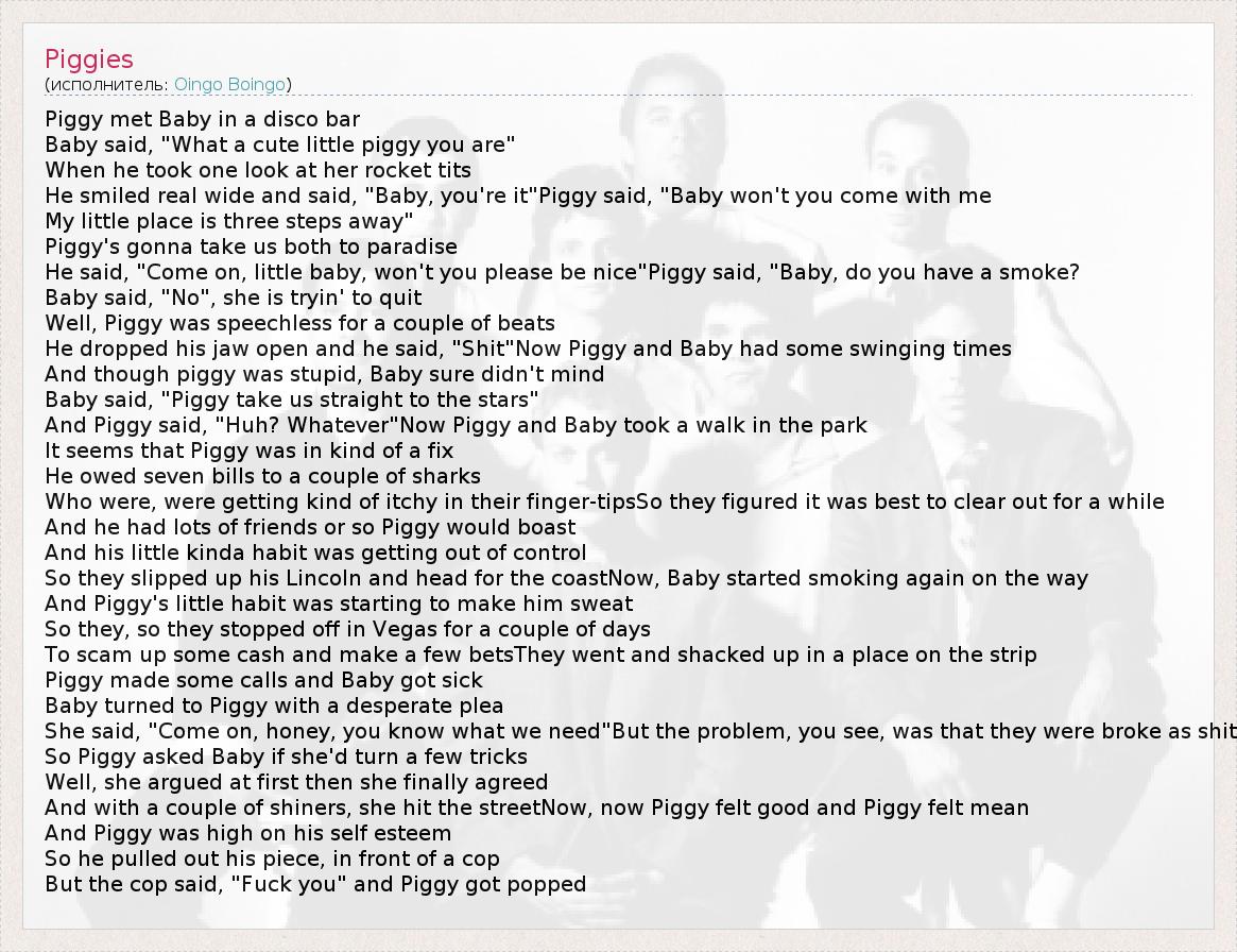 He smiled real wide and said, "Baby, you're it"Piggy said, "Baby won't you come with me