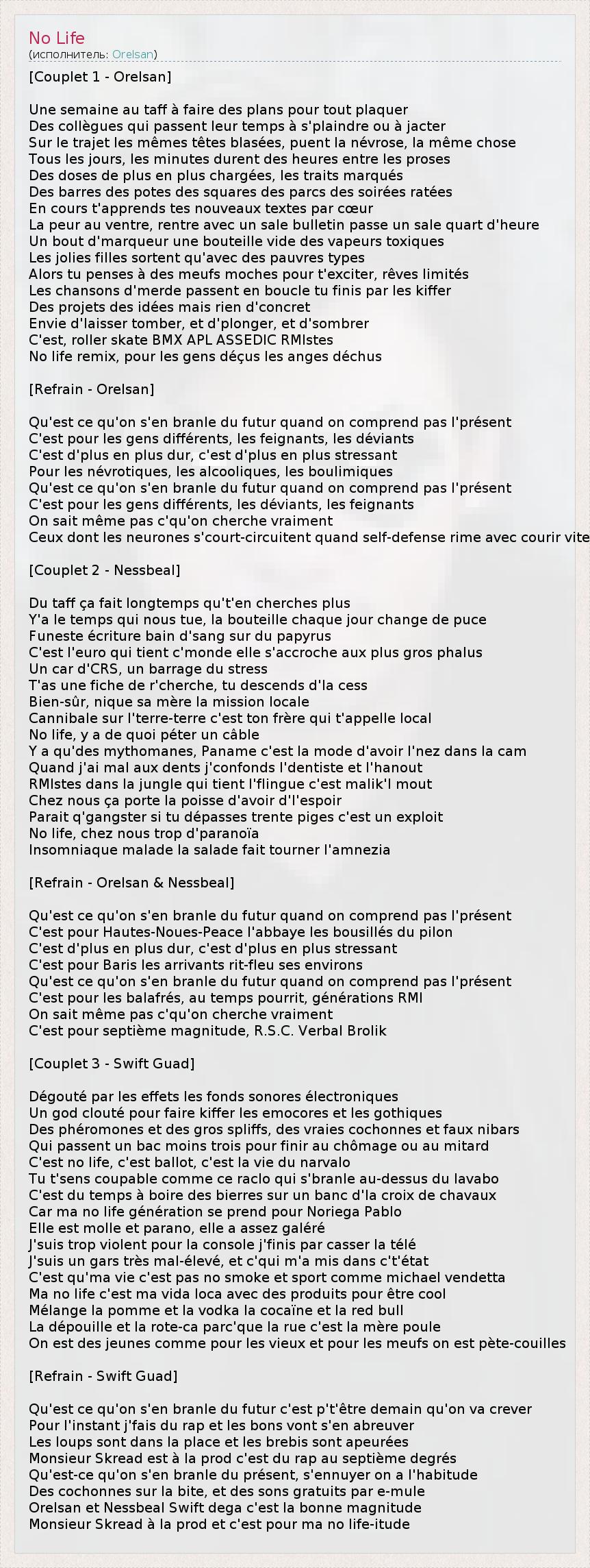 [Couplet 1 - Orelsan] Une semaine au taff à faire des plans pour tout plaquer Des collègues qui passent leur temps à s'plaindre ou à jacter Sur le trajet les mêmes têtes blasées, puent la névrose, la même chose Tous les jours, les minutes durent des heures entre les proses Des doses de plus en plus chargées, les traits marqués Des barres des potes des squares des parcs des soirées ratées En cours t'apprends tes nouveaux textes par cœur La peur au ventre, rentre avec un sale bulletin passe un sale quart d'heure Un bout d'marqueur une bouteille vide des vapeurs toxiques Les jolies filles sortent qu'avec des pauvres types Alors tu penses à des meufs moches pour t'exciter, rêves limités Les chansons d'merde passent en boucle tu finis par les kiffer Des projets des idées mais rien d'concret Envie d'laisser tomber, et d'plonger, et d'sombrer C'est, roller skate BMX APL ASSEDIC RMIstes No life remix, pour les gens déçus les anges déchus [Refrain - Orelsan] Qu'est ce qu'on s'en branle du futur quand on comprend pas l'présent C'est pour les gens différents, les feignants, les déviants C'est d'plus en plus dur, c'est d'plus en plus stressant Pour les névrotiques, les alcooliques, les boulimiques Qu'est ce qu'on s'en branle du futur quand on comprend pas l'présent C'est pour les gens différents, les déviants, les feignants On sait même pas c'qu'on cherche vraiment Ceux dont les neurones s'court-circuitent quand self-defense rime avec courir vite [Couplet 2 - Nessbeal] Du taff ça fait longtemps qu't'en cherches plus Y'a le temps qui nous tue, la bouteille chaque jour change de puce Funeste écriture bain d'sang sur du papyrus C'est l'euro qui tient c'monde elle s'accroche aux plus gros phalus Un car d'CRS, un barrage du stress T'as une fiche de r'cherche, tu descends d'la cess Bien-sûr, nique sa mère la mission locale Cannibale sur l'terre-terre c'est ton frère qui t'appelle local No life, y a de quoi péter un câble Y a qu'des mythomanes, Paname c'est la mode d'avoir l'nez dans la cam Quand j'ai mal aux dents j'confonds l'dentiste et l'hanout RMIstes dans la jungle qui tient l'flingue c'est malik'l mout Chez nous ça porte la poisse d'avoir d'l'espoir Parait q'gangster si tu dépasses trente piges c'est un exploit No life, chez nous trop d'paranoïa Insomniaque malade la salade fait tourner l'amnezia [Refrain - Orelsan & Nessbeal] Qu'est ce qu'on s'en branle du futur quand on comprend pas l'présent C'est pour Hautes-Noues-Peace l'abbaye les bousillés du pilon C'est d'plus en plus dur, c'est d'plus en plus stressant C'est pour Baris les arrivants rit-fleu ses environs Qu'est ce qu'on s'en branle du futur quand on comprend pas l'présent C'est pour les balafrés, au temps pourrit, générations RMI On sait même pas c'qu'on cherche vraiment C'est pour septième magnitude, R.S.C. Verbal Brolik [Couplet 3 - Swift Guad] Dégouté par les effets les fonds sonores électroniques Un god clouté pour faire kiffer les emocores et les gothiques Des phéromones et des gros spliffs, des vraies cochonnes et faux nibars Qui passent un bac moins trois pour finir au chômage ou au mitard C'est no life, c'est ballot, c'est la vie du narvalo Tu t'sens coupable comme ce raclo qui s'branle au-dessus du lavabo C'est du temps à boire des bierres sur un banc d'la croix de chavaux Car ma no life génération se prend pour Noriega Pablo Elle est molle et parano, elle a assez galéré J'suis trop violent pour la console j'finis par casser la télé J'suis un gars très mal-élevé, et c'qui m'a mis dans c't'état C'est qu'ma vie c'est pas no smoke et sport comme michael vendetta Ma no life c'est ma vida loca avec des produits pour être cool Mélange la pomme et la vodka la cocaïne et la red bull La dépouille et la rote-ca parc'que la rue c'est la mère poule On est des jeunes comme pour les vieux et pour les meufs on est pète-couilles [Refrain - Swift Guad] Qu'est ce qu'on s'en branle du futur c'est p't'être demain qu'on va crever Pour l'instant j'fais du rap et les bons vont s'en abreuver Les loups sont dans la place et les brebis sont apeurées Monsieur Skread est à la prod c'est du rap au septième degrés Qu'est-ce qu'on s'en branle du présent, s'ennuyer on a l'habitude Des cochonnes sur la bite, et des sons gratuits par e-mule Orelsan et Nessbeal Swift dega c'est la bonne magnitude Monsieur Skread à la prod et c'est pour ma no life-itude