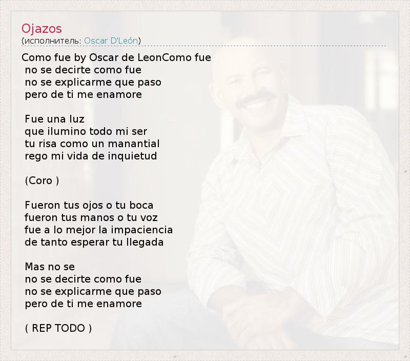 Como fue by Oscar de LeonComo fue no se decirte como fue no se explicarme que paso pero de ti me enamore Fue una luz que ilumino todo mi ser tu risa como un manantial rego mi vida de inquietud (Coro ) Fueron tus ojos o tu boca fueron tus manos o tu voz fue a lo mejor la impaciencia de tanto esperar tu llegada Mas no se no se decirte como fue no se explicarme que paso pero de ti me enamore ( REP TODO )