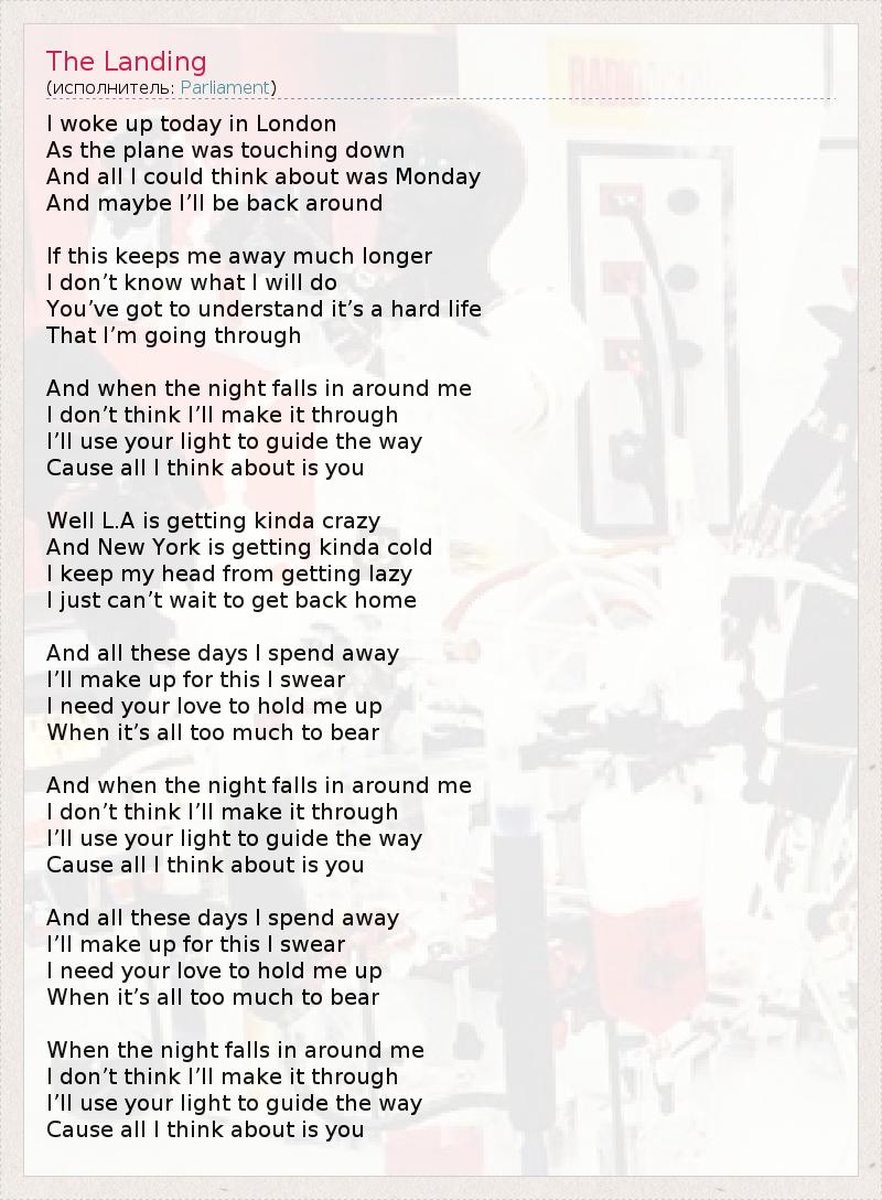 Сегодня я проснулся в Лондоне, Когда самолёт коснулся земли. Всё, о чём я мог думать, был понедельник, День, когда я, может быть, вернусь назад… Если что-то задержит меня дольше, Не знаю, что я буду делать. Нужно понять, что сейчас в моей жизни Непростой период. Когда надо мной сгустится ночь, Мне кажется, что я не переживу её. Лишь ты будешь моим путеводным светом, Потому что все мои мысли о тебе одной… Лос-Анджелес становится каким-то сумасшедшим, А Нью-Йорк – неприветливым. Борясь с первыми симптомами лени, Я жду не дождусь возвращения домой. Эти дни я проживаю впустую, Но, клянусь, что наверстаю упущенное. Твоя любовь - для меня опора в моменты, Когда ноша кажется непосильной. Когда надо мной сгустится ночь, Мне кажется, что я не переживу её. Лишь ты будешь моим путеводным светом, Потому что все мои мысли о тебе одной… Эти дни я проживаю впустую, Но, клянусь, что наверстаю упущенное. Твоя любовь - для меня опора в моменты, Когда ноша кажется непосильной. Когда надо мной сгустится ночь, Мне кажется, что я не переживу её. Лишь ты будешь моим путеводным светом, Потому что все мои мысли о тебе одной…