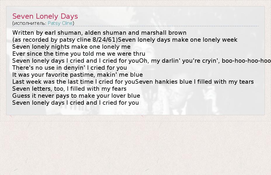 (as recorded by patsy cline 8/24/61)Seven lonely days make one lonely week