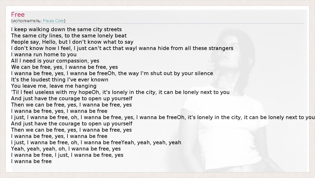 Это интересно:Паула Коул – удивительное явление в музыке поздних 90-х. Пола выросла в семье художницы и музыканта-любителя. Она родилась 5 апреля 1968 года в городе Рокпорт штата Массачусетс (США). В ее доме ежемгновенно звучала музыка, хотя около отродясь не играло радио или магнитофон. Музыкальным фоном были импровизации на разных инструментах в самых разных ситуациях, будь то посиделки на кухне или... продолжение