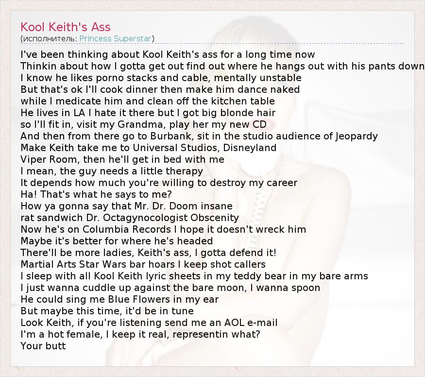 I've been thinking about Kool Keith's ass for a long time now Thinkin about how I gotta get out find out where he hangs out with his pants down I know he likes porno stacks and cable, mentally unstable But that's ok I'll cook dinner then make him dance naked while I medicate him and clean off the kitchen table He lives in LA I hate it there but I got big blonde hair so I'll fit in, visit my Grandma, play her my new CD And then from there go to Burbank, sit in the studio audience of Jeopardy Make Keith take me to Universal Studios, Disneyland Viper Room, then he'll get in bed with me I mean, the guy needs a little therapy It depends how much you're willing to destroy my career Ha! That's what he says to me? How ya gonna say that Mr. Dr. Doom insane rat sandwich Dr. Octagynocologist Obscenity Now he's on Columbia Records I hope it doesn't wreck him Maybe it's better for where he's headed There'll be more ladies, Keith's ass, I gotta defend it! Martial Arts Star Wars bar hoars I keep shot callers I sleep with all Kool Keith lyric sheets in my teddy bear in my bare arms I just wanna cuddle up against the bare moon, I wanna spoon He could sing me Blue Flowers in my ear But maybe this time, it'd be in tune Look Keith, if you're listening send me an AOL e-mail I'm a hot female, I keep it real, representin what? Your butt